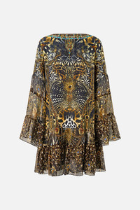 The Feline Folklore A-Line Gathered Panel Dress is a handcrafted silhouette designed by our in house artisans. Reimagined in an exclusive limited edition print, our A line panel dress is cut in relaxed fit and features a v neckline and flared sleeves. It's finished with intricately applied crystal embellishments. - 100% Silk - Crystal Embellishment - V Neckline - Relaxed Fit - Flared Sleeve - Neckline Tassels With Camilla Charms SKU 00038173-FELIFOLK-XXS Size and Fit Designed as a relaxed fit. Take your normal size, or select one size smaller for a neater fit. Fabric and Care 100% SILK With its subtly textured surface, silk crepe is our core fabrication made perfect for versatile wear. With its ability to hold alternative ways to wear, this decadent fabric drapes elegantly off the body whilst keeping you cool with its breathable nature.