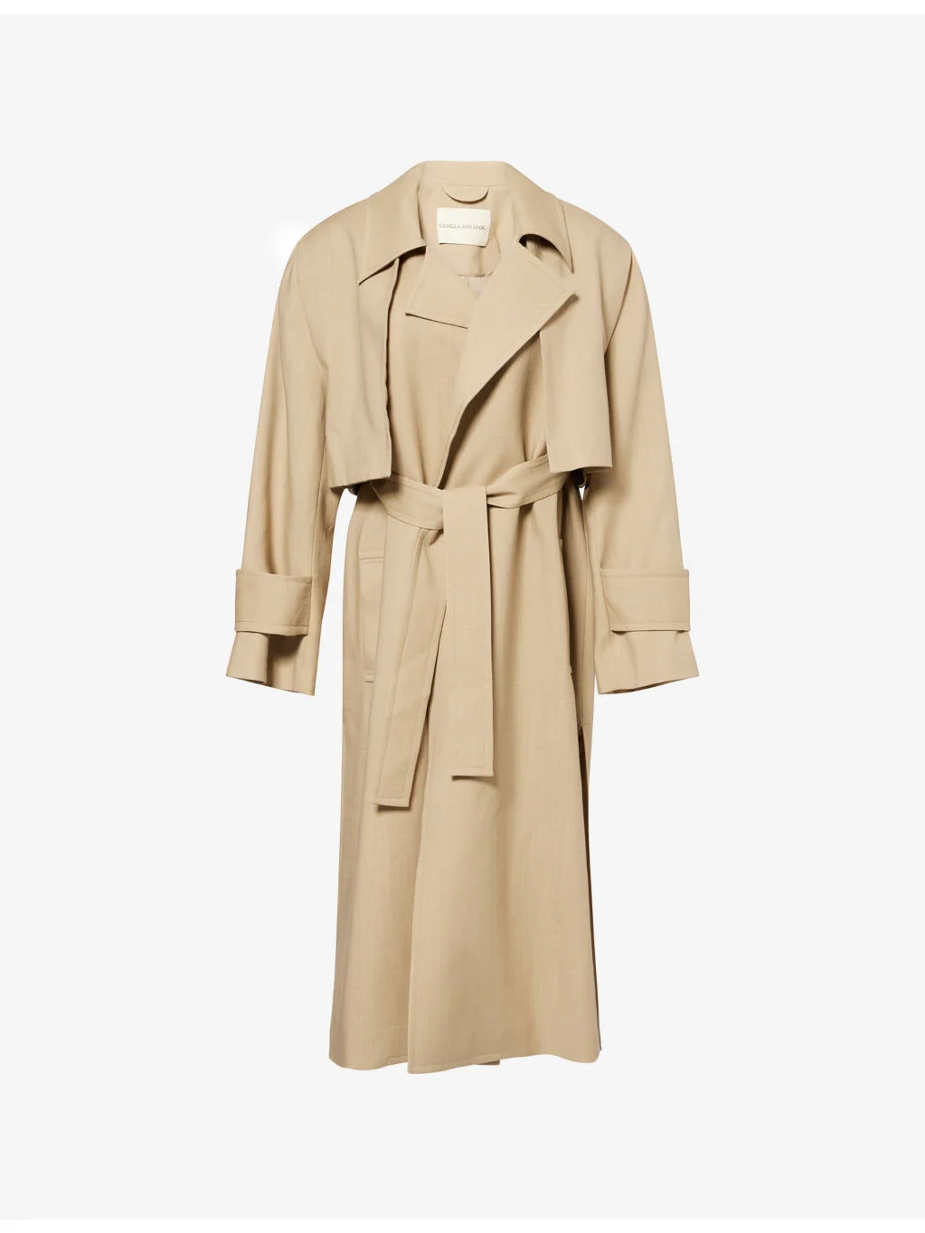 PRODUCT DETAILS - Camilla and Marc wool trench coat - 100% wool; lining 100% polyester - Self-tie fastening - Relaxed fit, notch lapels, draped storm flaps, throat-guard collar, padded shoulders, long sleeves, popper-fastened epaulette at cuffs, self-tie removeable belt, two welt pockets at sides, two vents at sides - Dry clean - True to size - Size S/M: length 50in / 127cm - Model is 5ft 10in/1.78m and wears a size small - Midweight, non-stretch Ref: R04566503