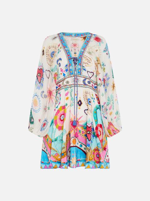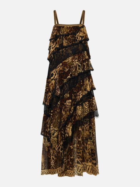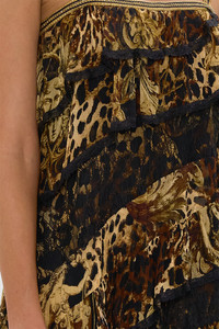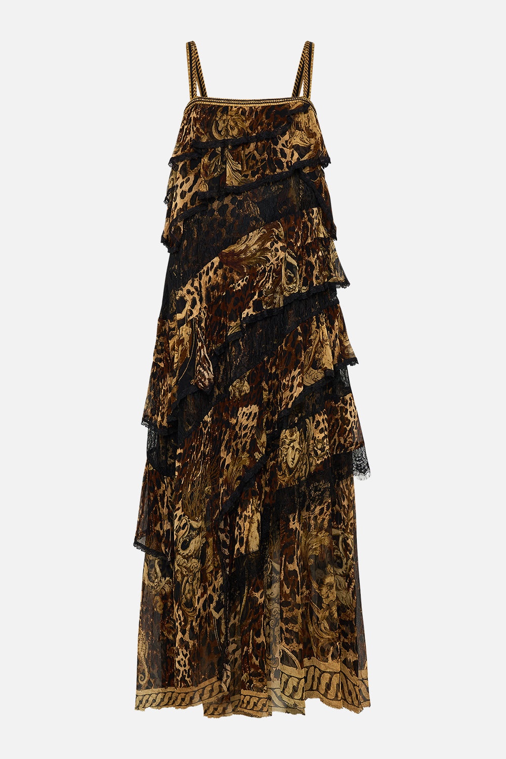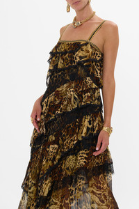 Designed in Australia, The Era Of Empires Asymmetric Spliced Lace Dress blends architectural splendor with echoes of classical antiquity and hieroglyphs against a backdrop of decadent black and luminous gold. Lovingly handcrafted, this CAMILLA asymmetric lace dress features wide shoulder straps and a voluminous fit throughout. Adorned with soft ruffles and fine lace panels and edgings, this striking dress imbues artful opulence. - Asymmetric Maxi Length - Attached Slip Lining - Tie Strap Detail - Lace Inset Detail - Ruffles SKU 00031821-ERAOEMPS-XS Size and Fit Our model wears a CAMILLA S and is 5'10 (178cm) tall. Her standard dress size is an AU 10. She has a 32in (83cm) bust, 35in (89.5cm) hips and a 25in (66cm) waist. Camilla S = AU10 / UK10 / US6 Designed as a relaxed fit, take your normal size or select one size smaller for a neater fit Fabric and Care 100% silk Silk crinkle chiffon is a sheer, lightweight fabric with a textured surface, crafted for a fluid drape with delicate stretch and a soft bounce.