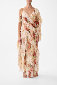 Designed in Australia, the Meet Me At The Majestic Asymmetric Spliced Ruffle Dress draws inspiration from the Majestic Cafe. Soft pinks evoke a romantic allure, capturing the essence of its storied prints. Lovingly handcrafted, this asymmetric spliced ruffle dress features splice ruffle details that create a dynamic, full-length silhouette. The 3D flower strands add a touch of whimsical mystery to this unique design. - Splice Ruffle Details - Full Length - Asymmetric Silhouette - 3D Flower Strands SKU 00034838-MEETMAJE-XXS Size and Fit Our model wears a CAMILLA S and is 5'10 (178cm) tall. Her standard dress size is an AU 10. She has a 32in (83cm) bust, 35in (89.5cm) hips and a 25in (66cm) waist. Camilla S = AU10 / UK10 / US6 Fabric and Care 100% SILK A featherlight, sheer, material renowned for its delicate flow and graceful drape, silk flat chiffon creates a softly cascading silhouette with a subtle lustre.