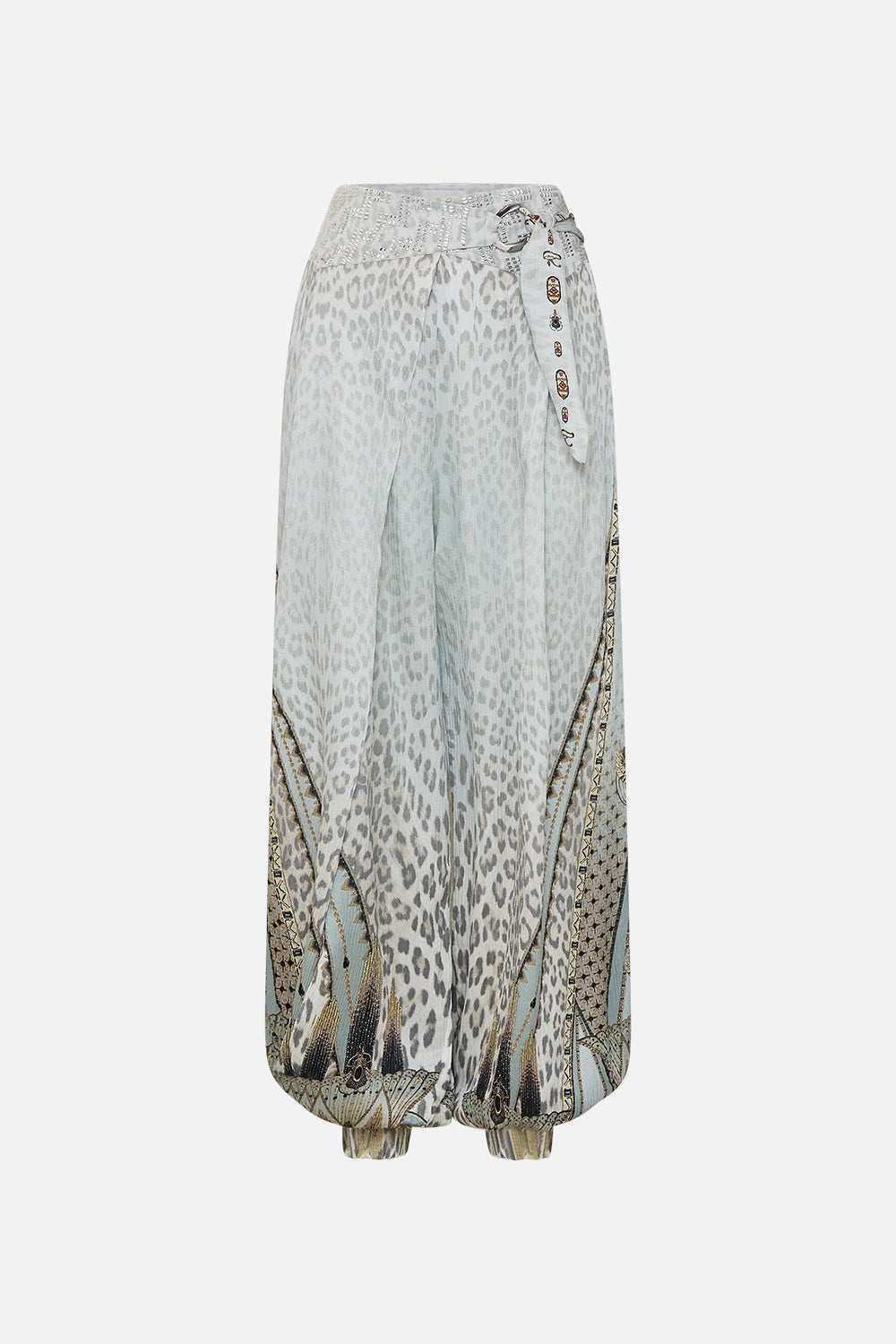 Designed in Australia, The Sahara Starlet Asymmetrical Belted Pant is an ode to the vintage Art Deco motifs of the Egyptian Revival, transcending time with a radiant pearlescent backdrop and intricate gold filigree designs. Lovingly handcrafted, these asymmetric belted pants offer a luxurious twist on relaxed style with their harem fit and full length. The fitted wrap waistband, detailed with striking hardware, cinches the waist elegantly, while a split detail opening on the right leg adds a touch of modern sophistication. - Relaxed Harem Fit - Full Length - Fitted Wrap Waistband With Hardware Detail - Split Detail Opening On Right Leg SKU 00031402-SAHASTAR-XS Size and Fit Our model wears a CAMILLA S and is 5'10 (178cm) tall. Her standard dress size is an AU 10. She has a 32in (83cm) bust, 35in (89.5cm) hips and a 25in (66cm) waist. Camilla S = AU10 / UK10 / US6 Designed and fitted true to size, take normal size. Fabric and Care 100% SILK