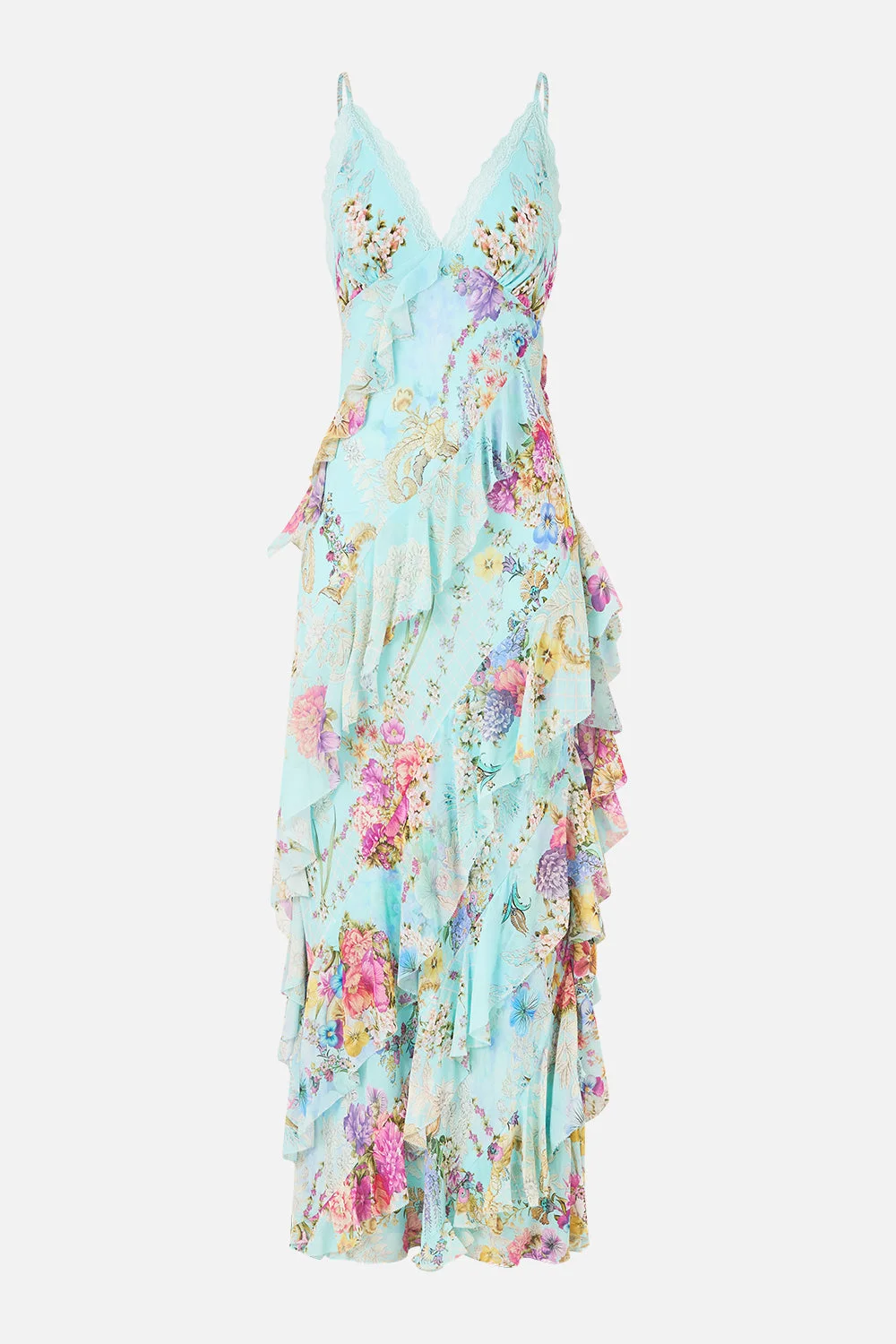 The Bazaar Blooms Asymmetrical Ruffle Slip Dress is a handcrafted silk silhouette designed by our in house artisans. Reimagined in an exclusive limited edition print, this romantic slip dress features cascading waterfall ruffles edged in delicate lace that flow from neckline to asymmetrical floor-length hem. The bias cut skirt honours the feminine form, while adjustable straps offer a custom fit along the neckline. - 100% Silk - Waterfall Ruffle Detail - Bias Skirt - Adjustable Strap Length - Fully Lined - Lace Edge Trim SKU 00038451-BAZABLOM-XXS Fabric and Care 100% SILK