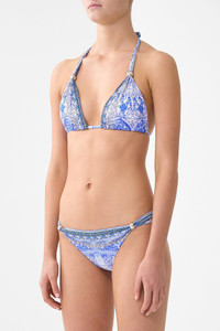 The Bosphorous Ball Trim Tri Bikini Set With Thick Neck Tie is a handcrafted silhouette designed by our in house artisans. Reimagined in an exclusive limited edition print, this triangle bikini set is made with B to C cups in mind with soft removable cups and adjustable ties on the bikini top. Its cut with a hipster rise with mini bottom coverage and adjustable metal trims decorate the front sides of the bikini. Its finished with intricately placed crystal embellishments for luminous detail. - Fits B to C Cup - Removable Soft Cups - Hipster Rise And Mini Regular Bottom Coverage - Adjustable Metal Trims On Side Front Bikini Bottom And Front Cups - Adjustable Tie Top - Crystal Embellishment SKU 00041271-BOSPHORS-XS Size and Fit Our model is 5'10 (178cm) tall and wears a size S (AU 10). Bust: 40in (101.6cm) Waist: 26.5in (67cm) Hips: 38in (96.5cm) Fabric and Care MAIN: 82% REGENERATED POLYAMIDE, 18% ELASTANE ECONYL is regenerated nylon, crafted from waste materials that would otherwise end up polluting our Mother Earth. Its beauty lies in its ability to be recycled, remoulded and ultimately reused time and time again. An infinitely recyclable product that keeps our planet looking beautiful, it opens the door to a circular fashion sphere.