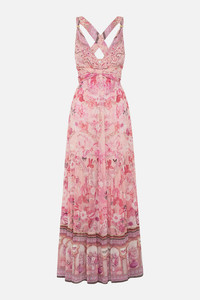 Designed in Australia, The Botanical Novella Bead Strap Gathered Panel Dress encapsulates a timeless elegance with butterflies delicately settled amid vivid palace florals, framed by arches and gilded borders. Lovingly handcrafted, this luxury maxi dress features a chic plunge neckline with straps that flow into a cross-back detail. The flowy skirt falls to a full-length hemline to create romantic billow with every step. - Crystal Embellishment - Gathered Skirt Panels - Shirring At Back Waist - Hardware Detail At Straps - Cross Back Straps SKU 00032236-BOTANOVL-XS Size and Fit Our model wears a CAMILLA S and is 5'10 (178cm) tall. Her standard dress size is an AU 10. She has a 32in (83cm) bust, 35in (89.5cm) hips and a 25in (66cm) waist. Camilla S = AU10 / UK10 / US6 Designed as a true to size fit take your normal size. Fabric and Care SELF-100% SILK LINING-100% SILK Silk crinkle chiffon is a sheer, lightweight fabric with a textured surface, crafted for a fluid drape with delicate stretch and a soft bounce.
