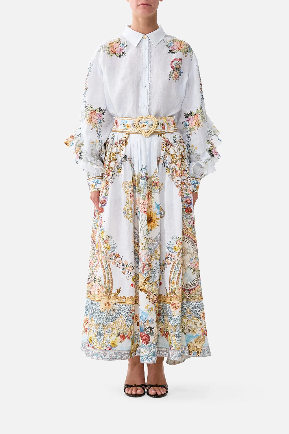 The Seville Sweetheart Belted Midi Skirt is a handcrafted silhouette designed by our in-house artisans. Imagined in an exclusive limited edition print, this decadent linen midi skirt features a fit and flare cut complete with a cinching wide waistband. Finished with a separate belt for styling versatility, it features pocket functionality and intricately applied embellishments for luminous detail. - 100% Linen - Pleated Detail - Removable Belt - Inseam Pockets - Wide Waistband SKU 00041978-SEVISWET-XS Size and Fit Our model is 5'10 (178cm) tall and wears a size S (AU 10). Bust: 40in (101.6cm) Waist: 26.5in (67cm) Hips: 38in (96.5cm) Fabric and Care 100% LINEN Made from flax fibres, this lightweight natural fibre offers a timeless aesthetic that adds durability and longevity to any wardrobe. Its breathability keeps your skin cool, minimises moisture and ensures effortless comfort.