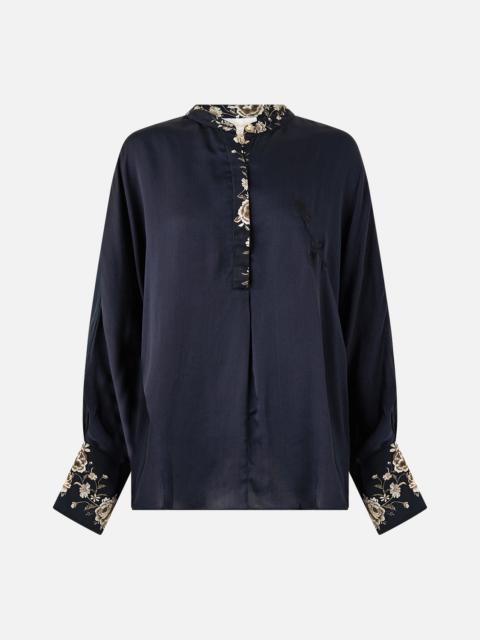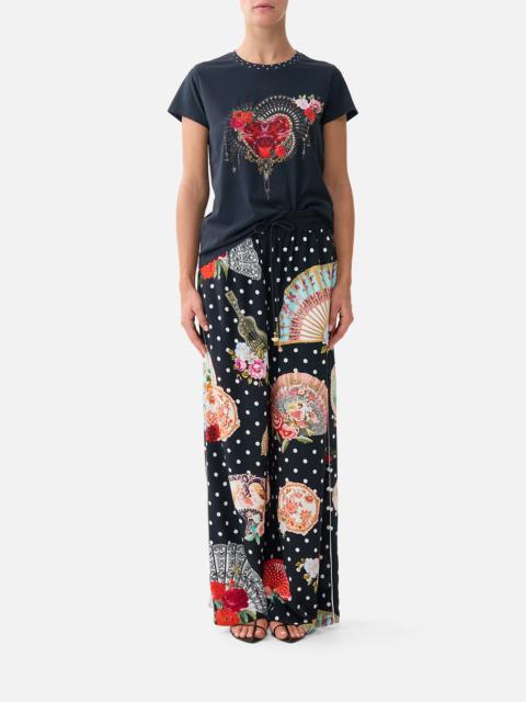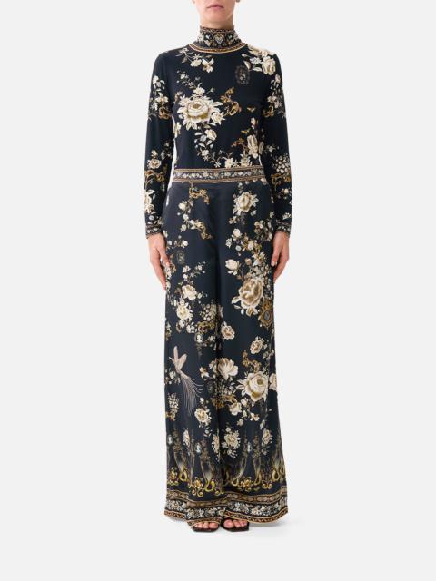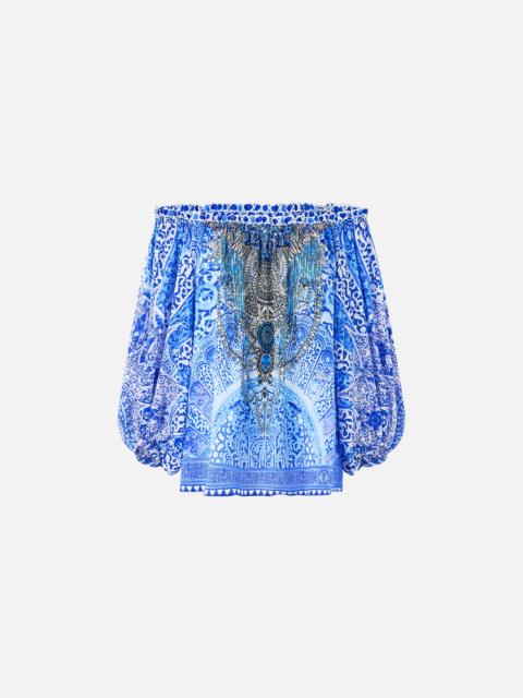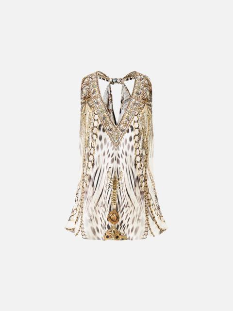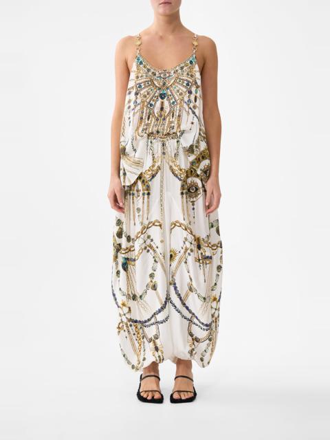 Taking over 90 hours to complete, this silk camisole is a testament to devotion, every stitch, bead and sequin a story of artistry. Hand-embroidered by our skilled artisans, this top comes alive with intricate zari thread work, glass beads, metal sequins and crystal rhinestones, each detail catching the light like stardust upon silk. Delicate metal charms add dimension and movement, transforming the fabric into a living canvas of shimmer and soul. Finished with hand-placed crystal adornments that trace the silhouette in radiant brilliance, it's a wearable work of art, an expression of craftsmanship and beauty. The Amulets And Alchemy Bias Crop Cami is a handcrafted silhouette designed by our in house artisans. Reimagined in an exclusive limited edition print, this cowl neck cami is cut on the bias to honour the feminine form and drapes across the body to a cropped hemline. It features a chain strap for elevated wear and is finished with intricately placed crystal embellishments for luminous detail. - 100% Silk - Cowl Neck - Cropped Length - Chain Strap - Bias Cut - Crystal Embellishment SKU 00041073-AMULALCH-XS Size and Fit Our model is 5'10 (178cm) tall and wears a size S (AU 10). Bust: 40in (101.6cm) Waist: 26.5in (67cm) Hips: 38in (96.5cm) Fabric and Care 100% SILK Silk satin embodies a sumptuously smooth finish that offers a rich buttery touch to the skin. As a result of the satin weaving technique, it masterfully creates a fuller bounce to the body and drape details.