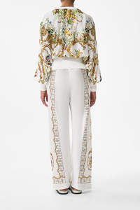 Designed in Australia, the Dressing Room Drama Bias Cut Drawstring Pant embodies a white base fused with florals and golden arches, inspired by the arabesque opulence of the Palace of Queluz and its storied princess chambers. Lovingly handcrafted, this luxurious silk pant is designed for effortless wearability. This CAMILLA silk wide leg pant cinches at the high waist with a fine drawstring detail, creating a soft billow with every step. The full-length palazzo pant drapes softly due to its bias cut silhouette. - Drawstring Waist - Pockets - Wide Leg - Full Length - Crystal Embellishment - Relaxed Fit SKU 00034755-DRESDRAM-XXS Size and Fit Our model wears a CAMILLA S and is 5'10 (178cm) tall. Her standard dress size is an AU 10. She has a 32in (83cm) bust, 35in (89.5cm) hips and a 25in (66cm) waist. Camilla S = AU10 / UK10 / US6 Designed as a relaxed fit—take your normal size, or select one size smaller for a neater fit. Fabric and Care 100% SILK CHARMEUSE Silk satin embodies a sumptuously smooth finish that offers a rich buttery touch to the skin. As a result of the satin weaving technique, it masterfully creates a fuller bounce to the body and drape details.