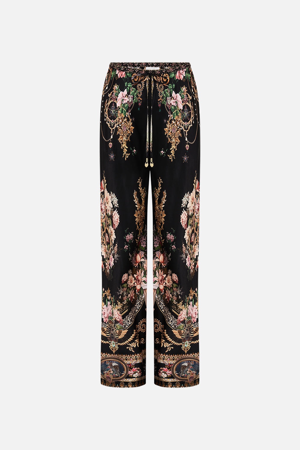 Fabricated with breathtaking precision and awe inspiring luxury, this collector's treasure is a CAMILLA best-selling creation. The Dynasty Daze Bias Cut Drawstring Pant is an immersion into an opulent world of rich black adorned with delicate florals and decorative golden fronds. A luxurious silk pant designed for effortless wearability, this CAMILLA silk wide leg pant cinches at high waist with a fine drawstring detail. Creating a soft billow with every step this full length palazzo pant drapes softly due to its bias cut silhouette. - Lovingly Handcrafted - Designed in Australia - CAMILLA Ready-To-Wear - Crystal embellishment - Drawstring waist - Pocket functionality - Wide leg - Custom tassels - Full length leg - Bias cut SKU 00032927-DYNADAZE-XXS Size and Fit Our model wears a CAMILLA S and is 5'10 (178cm) tall. Her standard dress size is an AU 10. She has a 32in (83cm) bust, 35in (89.5cm) hips and a 25in (66cm) waist. Camilla S = AU10 / UK10 / US6 Designed as a relaxed fit, take your normal size Fabric and Care 100% SILK