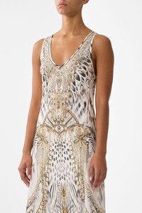 The Lady Lionheart Bias Cut Tank Dress is a handcrafted silhouette designed by our in house artisans. Reimagined in an exclusive limited edition print, our full length tank dress is cut on the bias for a flattering, slim fit. Framed by a rounded v neckline and finished with a front side split, it's an effortless essential made for movement. - 100% Silk - Slim Fit - Full Length - Rounded V Neckline - Front Side Split - Crystal Embellishment SKU 00040970-LADYLION-XXS Size and Fit Our model is 5'10 (178cm) tall and wears a size S (AU 10). Bust: 40in (101.6cm) Waist: 26.5in (67cm) Hips: 38in (96.5cm) Designed and fitted true to size, take your normal size. Fabric and Care 100% SILK Silk satin embodies a sumptuously smooth finish that offers a rich buttery touch to the skin. As a result of the satin weaving technique, it masterfully creates a fuller bounce to the body and drape details.