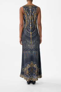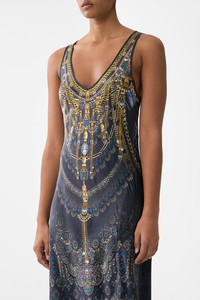 The Song Of The Solstice Bias Cut Tank Dress is a handcrafted silk silhouette designed by our in house artisans. Reimagined in an exclusive limited edition print, our full length tank dress is cut on the bias for a flattering, slim fit. Framed by a rounded v neckline and finished with a front side split, it's an effortless essential made for movement. - 100% Silk - Slim Fit - Full Length - Rounded V-Neckline - Front Side Split SKU 00039512-SONGSOLS-XXS Size and Fit Our model is 5'10 (178cm) tall and wears a size S (AU 10). Bust: 40in (101.6cm) Waist: 26.5in (67cm) Hips: 38in (96.5cm) Fabric and Care 100% SILK Silk satin embodies a sumptuously smooth finish that offers a rich buttery touch to the skin. As a result of the satin weaving technique, it masterfully creates a fuller bounce to the body and drape details.