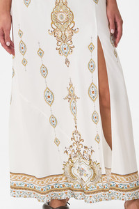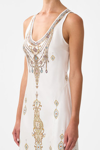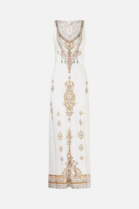 The Ottoman Dynasty Bias Cut Tank Dress is a handcrafted silk silhouette designed by our in house artisans. Reimagined in an exclusive limited edition print, our full length tank dress is cut on the bias for a flattering, slim fit. Framed by a rounded v neckline and finished with a front side split, it's an effortless essential made for movement. - 100% Silk - Slim Fit - Full Length - Rounded V Neck - Front Side Split SKU 00037327-OTTODYNA-XXS Size and Fit Our model is 5'10 (178cm) tall and wears a size S (AU 10). Bust: 40in (101.6cm) Waist: 26.5in (67cm) Hips: 38in (96.5cm) Designed and fitted true to size, take your normal size. Fabric and Care 100% SILK CHARMEUSE Silk satin embodies a sumptuously smooth finish that offers a rich buttery touch to the skin. As a result of the satin weaving technique, it masterfully creates a fuller bounce to the body and drape details.