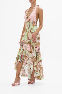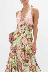 Designed in Australia, The Queens Quarters Bias Halter Dress With Ruffle Hem is inspired by the interiors of the Palace of Queluz—framed florals, ornate borders, and intricate ceiling and floor details echo its regal charm. Lovingly handcrafted, this full-length dress features a bias cut that drapes gracefully with a dramatic split. The halter neckline with a low back and ruffle hem adds a touch of elegance, while exquisite hand embroidery provides a bespoke finish. - Bias Cut - Full Length With Split - Halter Neckline With Low Back - Ruffle Hem - Crystal Embellishment - Non-Sheer SKU 00033400-QUARQUEN-XXS Size and Fit Our model wears a CAMILLA O/S and is 5'10 (178cm) tall. Her standard dress size is an AU 10. She has a 32in (83cm) bust, 35in (89.5cm) hips and a 25in (66cm) waist. Designed as a relaxed fit, take your normal size or select one size smaller for a neater fit Fabric and Care 100%SILK CHARMEUSE Silk satin embodies a sumptuously smooth finish that offers a rich buttery touch to the skin. As a result of the satin weaving technique, it masterfully creates a fuller bounce to the body and drape details.