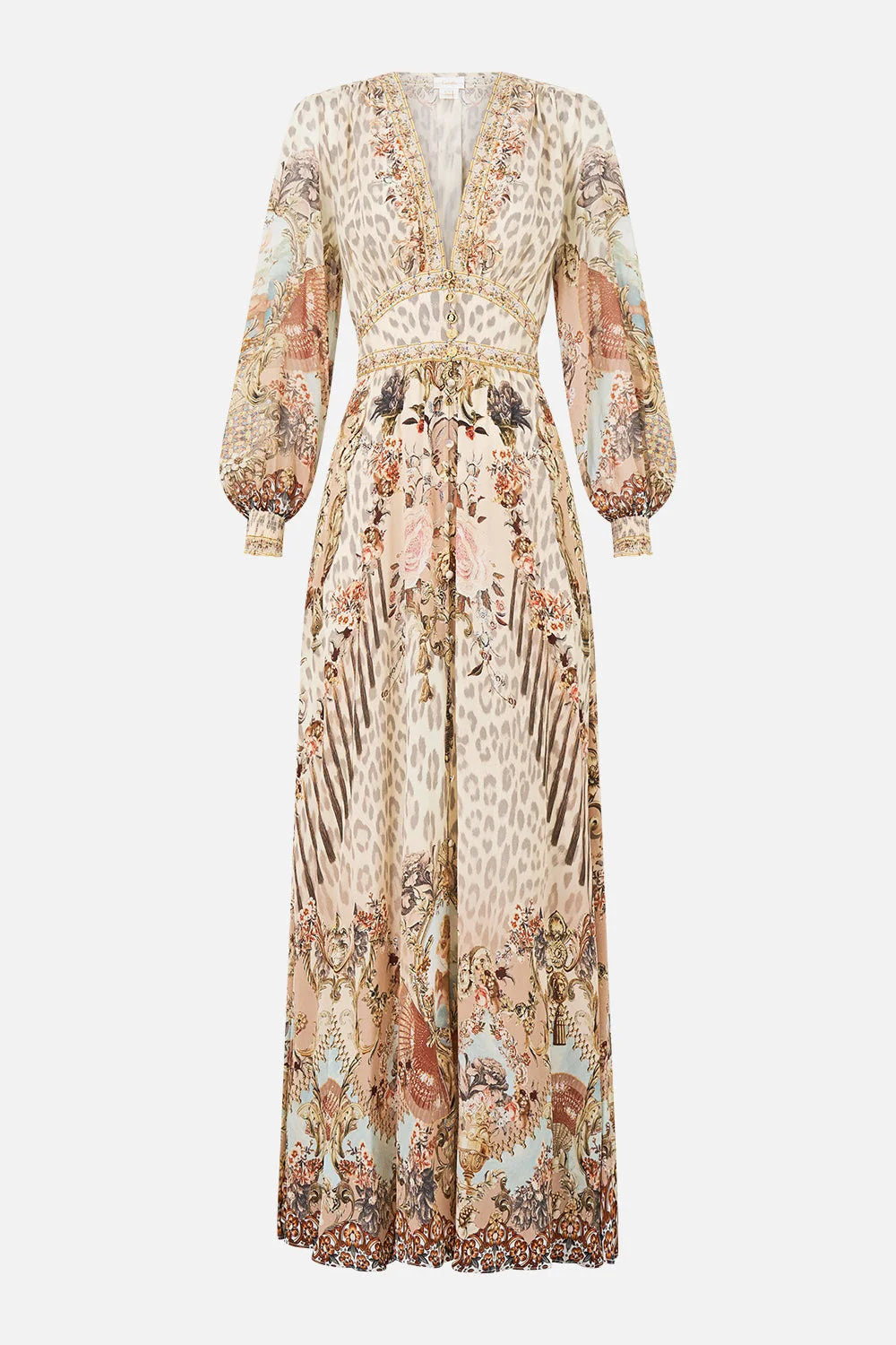 The Aranjuez Animalia Button Dress With Shaped Waistband is a handcrafted silhouette designed by our in-house artisans. Imagined in an exclusive limited edition print, our silk full length dress features a deep v-neckline and shaped waistband that sculpts the feminine form. It's finished with front button closure and intricately applied crystal embellishments. - 100% Silk - Crystal Embellishment - Deep V Neckline - Full Length - Front Button Closure SKU 00040681-ARANANIM-XXS Size and Fit Our model is 5'10 (178cm) tall and wears a size S (AU 10). Bust: 40in (101.6cm) Waist: 26.5in (67cm) Hips: 38in (96.5cm) Designed as a relaxed fit. Take your normal size, or select one size smaller for a neater fit. Fabric and Care SELF-100% SILK CONTRAST-100% SILK With its subtly textured surface, silk crepe is our core fabrication made perfect for versatile wear. With its ability to hold alternative ways to wear, this decadent fabric drapes elegantly off the body whilst keeping you cool with its breathable nature.