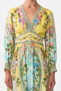 The Tales Of Topkapi Palace Button Dress With Shaped Waistband is a handcrafted silk silhouette designed by our in house artisans. Reimagined in an exclusive limited edition print, our full length dress features a deep V neckline and shaped waistband that sculpts the feminine form. Finished with front button closure and intricately applied crystal embellishments. - 100% Silk - Crystal Embellishment - Deep V Neckline - Full Length - Front Button Closure SKU 00037334-TALETOPI-XXS Size and Fit Our model is 5'10 (178cm) tall and wears a size S (AU 10). Bust: 40in (101.6cm) Waist: 26.5in (67cm) Hips: 38in (96.5cm) Designed as a relaxed fit, take your normal size, or select one size smaller for a neater fit. Fabric and Care 100% SILK With its subtly textured surface, silk crepe is our core fabrication made perfect for versatile wear. With its ability to hold alternative ways to wear, this decadent fabric drapes elegantly off the body whilst keeping you cool with its breathable nature.