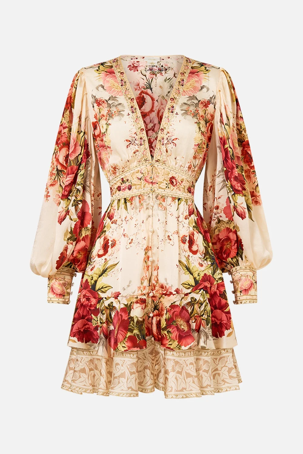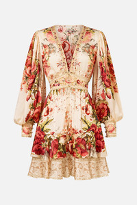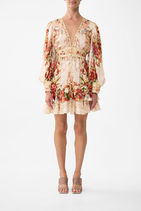Designed in Australia, the Meet Me At The Majestic Button Front Frill Dress draws inspiration from the Majestic Cafe. Soft pinks evoke a romantic allure, capturing the essence of its storied prints. Lovingly handcrafted, this CAMILLA silk dress is ornamented with a fit-and-flare silhouette, flowing into a double ruffle mini length hemline. The sumptuous mini dress features a V-neckline and playful blouson sleeves that radiate femininity. - Button Front Closure - Shaped Waistband With Elastic Back - V Neckline - Crystal Embellishment - Mini Length SKU 00035251-MEETMAJE-XXS Size and Fit Designed as a relaxed fit—take your normal size, or select one size smaller for a neater fit. Fabric and Care 100% SILK Silk satin embodies a sumptuously smooth finish that offers a rich buttery touch to the skin. As a result of the satin weaving technique, it masterfully creates a fuller bounce to the body and drape details.