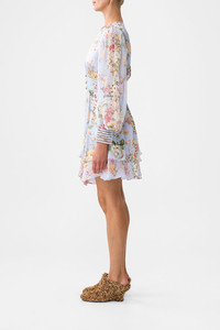 The Tiled In Time Button Front Frill Dress is a handcrafted silk silhouette designed by our in house artisans. Reimagined in an exclusive limited edition print, our short fit and flare dress features a V neckline that meets a shaped waistband with an elasticated back for comfort and fit. Finished with button front details and soft frill accents for feminine movement. - 100% Silk - V Neckline - Short Length - Fit And Flare - Shaped Waistband With Elastic Back SKU 00036496-TILETIME-XXS Size and Fit Our model is 5'10 (178cm) tall and wears a size S (AU 10). Bust: 40in (101.6cm) Waist: 26.5in (67cm) Hips: 38in (96.5cm) Fabric and Care 100% SILK Silk satin embodies a sumptuously smooth finish that offers a rich buttery touch to the skin. As a result of the satin weaving technique, it masterfully creates a fuller bounce to the body and drape details.