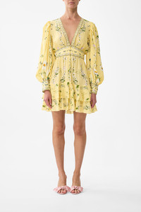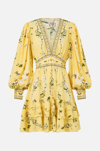 Designed in Australia, the Daisy Chains Button Front Frill Dress celebrates golden fields and sunlit days. Daisies and multi botanicals weave through textiles, lace and tapestries, telling a story of carefree wonder. Lovingly handcrafted, this CAMILLA silk dress is ornamented with a fit-and-flare silhouette, flowing into a double ruffle mini length hemline. The sumptuous mini dress features a V neckline and sophisticated blouson sleeves that radiate elegant femininity. - Button Front Closure - Shaped Waistband With Elastic Back - Crystal Embellishment - V Neckline - Mini Length SKU 00037820-DAISCHAN-XXS Size and Fit Designed as a relaxed fit—take your normal size, or select one size smaller for a neater fit. Fabric and Care 100% SILK With its subtly textured surface, silk crepe is our core fabrication made perfect for versatile wear. With its ability to hold alternative ways to wear, this decadent fabric drapes elegantly off the body whilst keeping you cool with its breathable nature.