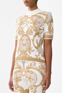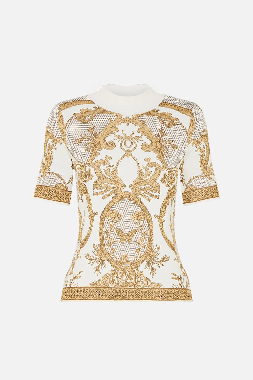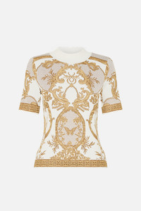 Designed in Australia, the Dressing Room Drama Mock Neck Knit Top unveils a black base fused with florals and gilded arches, echoing the regal opulence of the Palace of Queluz—a poetic nod to throne rooms and the queen's dressing sanctuary. Lovingly handcrafted, this mock neck knit top features a fitted body in jacquard knit. Cap sleeves and a cropped length complete the look, making it perfect for layering or wearing solo. - Fitted Body - Jacquard Knit - Cap Sleeve - Cropped Length SKU 00035520-DRESDRAM-S Fabric and Care 70% VISCOSE 13% NYLON 13% POLYESTER 4% METALLIZED FILM