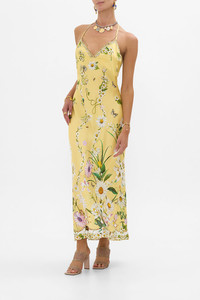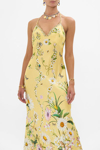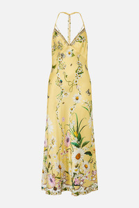 Designed in Australia, the Daisy Chains Chain Detail Slip Dress celebrates golden fields and sunlit days. Daisies and multi botanicals weave through textiles, lace and tapestries, telling a story of carefree elegance. Lovingly handcrafted, this CAMILLA silk slip dress features streamlined bust shaping that flows into a bias cut body with a full-length hemline. The fine strap detail is adorned with a delicate detachable gold chain for added CAMILLA opulence. - Bias Cut - Long Length - Crystal Embellishment - Removable Chain Detail SKU 00034745-DAISCHAN-XXS Size and Fit Designed and fitted true to size, take your normal size. Fabric and Care 100% SILK CHARMEUSE Silk satin embodies a sumptuously smooth finish that offers a rich buttery touch to the skin. As a result of the satin weaving technique, it masterfully creates a fuller bounce to the body and drape details.