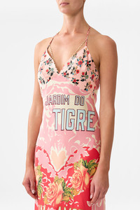 Designed in Australia, The Pink Porto Chain Detail Slip Dress refines blossoming romance, floral gardens dance along pastel pink mosaics kissed with red touches. Lovingly handcrafted, this CAMILLA silk slip dress features streamlined bust shaping that flows into a bias cut body with a full-length hemline. The fine strap detail is adorned with a detachable gold chain for added CAMILLA opulence. - Slim Fit - Long Length - Removable Chain Detail - Bias Cut - Adjustable Strap SKU 00035711-PINKPORT-XXS Size and Fit Our model wears a CAMILLA S and is 5'10 (178cm) tall. Her standard dress size is an AU 10. She has a 32in (83cm) bust, 35in (89.5cm) hips and a 25in (66cm) waist. Camilla S = AU10 / UK10 / US6 Designed and fitted true to size, take your normal size. Fabric and Care 100% SILK CHARMEUSE Silk satin embodies a sumptuously smooth finish that offers a rich buttery touch to the skin. As a result of the satin weaving technique, it masterfully creates a fuller bounce to the body and drape details.
