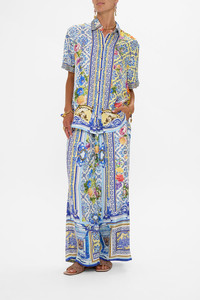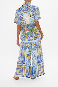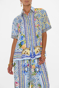 Designed in Australia, The Wall To Wall Wonders Classic Shirt captures the grandeur of Queluz Palace, with soft blues and golden yellows of Azulejo tiles, blending history and artistry in a panoramic view of Portugal’s timeless beauty. Lovingly handcrafted, this classic shirt combines effortless sophistication with timeless appeal. The regular fit and hip-length cut create a refined silhouette, while the button-front closure offers understated structure. Half sleeves add a modern, yet classic touch, making this piece a versatile staple for any wardrobe. - Regular Fit - Hip Length - Button Front Closure - Half Sleeve - Non-Sheer SKU 00034012-WALLWOND-XXS Size and Fit Fitted True to Size Fabric and Care 100% SILK Silk twill is renowned for its diagonally-patterned weave and fluid texture. Its high thread count ensures rich density and durability, while its beautiful sheen provides a luscious touch to the skin.