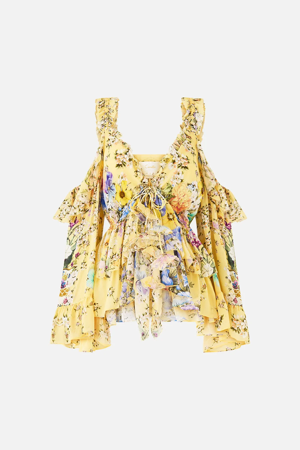 The Darling Buds Cold Shoulder Ruffle Top is a handcrafted silk silhouette designed by our in house artisans. Reimagined in an exclusive limited edition print, this ruffle top features an exposed shoulder cut and is relaxed fitting through the body. Its tie front and layered lace ruffles add playful detail to this delicate, feminine top. - 100% Silk - Relaxed Fit - Tie Front - Ruffle Detailing - Cold Shoulder - Tassel Details - Crystal Embellishment SKU 00038359-DARLBUDS-XS Size and Fit Our model is 5'10 (178cm) tall and wears a size S (AU 10). Bust: 40in (101.6cm) Waist: 26.5in (67cm) Hips: 38in (96.5cm) Fabric and Care 100% SILK