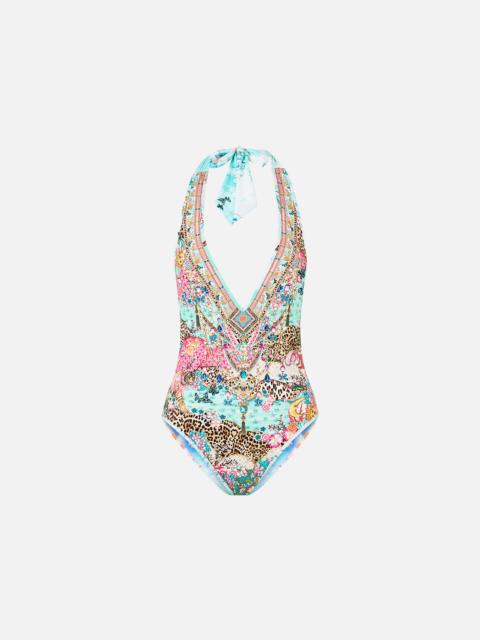 The Feline Folklore Continuous Underwire One Piece With Keyhole is a handcrafted silhouette designed by our in house artisans. Reimagined in an exclusive limited edition print, this one piece is made with D cups in mind with underwire support and adjustable straps for versatility. It features a keyhole at the centre of the bust and is finished with intricately placed crystal embellishments for luminous detail. - Fits D Cup - Soft Cups - Underwire Support - Adjustable Straps - Keyhole At Centre Front - Crystal Embellishment SKU 00039396-FELIFOLK-XS Size and Fit Our model is 5'10 (178cm) tall and wears a size S (AU 10). Bust: 40in (101.6cm) Waist: 26.5in (67cm) Hips: 38in (96.5cm) Fabric and Care MAIN: 80% REGENERATED POLYAMIDE, 20% ELASTANE
