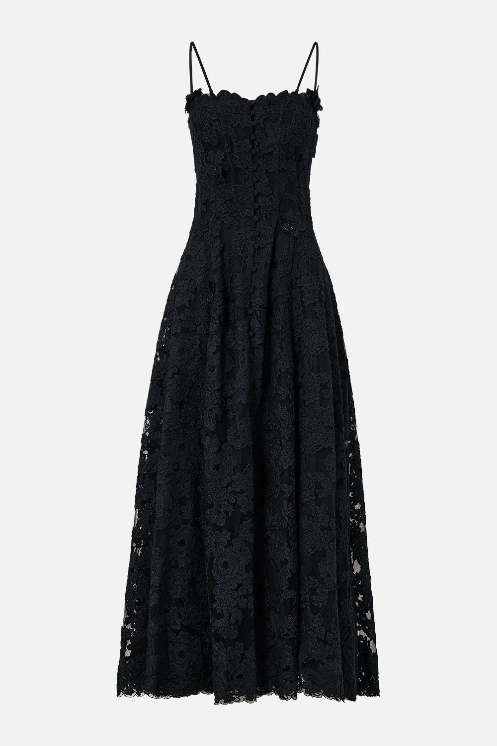 Designed in Australia, the Noble Endeavours Corset Dress With Long Flared Skirt unveils a black base fused with florals and gilded arches, echoing the regal opulence of the Palace of Queluz—a poetic nod to throne rooms and the queen's dressing sanctuary. Lovingly handcrafted, this corset dress blends structure with fluidity. A fitted bodice meets a full-length flared skirt, complete with a button-through front and a daring centre front split for a touch of drama. - Fitted Corset Bodice - Full Length Flared Skirt - Button Through Front - Lace Embroidery - Crystal Embellishment SKU 00037835-NOBLENDE-XXS Size and Fit Our model wears a CAMILLA S and is 5'10 (178cm) tall. Her standard dress size is an AU 10. She has a 32in (83cm) bust, 35in (89.5cm) hips and a 25in (66cm) waist. Camilla S = AU10 / UK10 / US6 Fabric and Care BASE: 100% NYLON YARN: 100% POLYESTER (CORDED EMB)