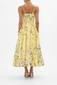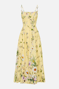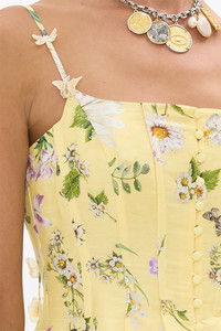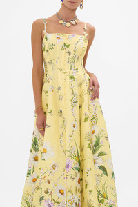 Designed in Australia, the Daisy Chains Corset Dress With Long Flared Skirt celebrates golden fields and sunlit days. Daisies and multi botanicals weave through textiles, lace and tapestries, telling a story of carefree wonder. Lovingly handcrafted, this corset dress blends structure with fluidity. A fitted bodice meets a full-length flared skirt, complete with a button-through front and a daring centre front split for a touch of drama. - Fitted Corset Bodice - Full Length Flared Skirt - Button Through Front - Adjustable Straps SKU 00034768-DAISCHAN-XXS Fabric and Care 82% LINEN 18% SILK Silk Linen is a beautiful combination of natural fabrics which blend into a luxurious, soft and smooth texture. Cool to touch with a subtle sheen and luster from silk components, its breathable, durable and has a crisp, textured hand feel.