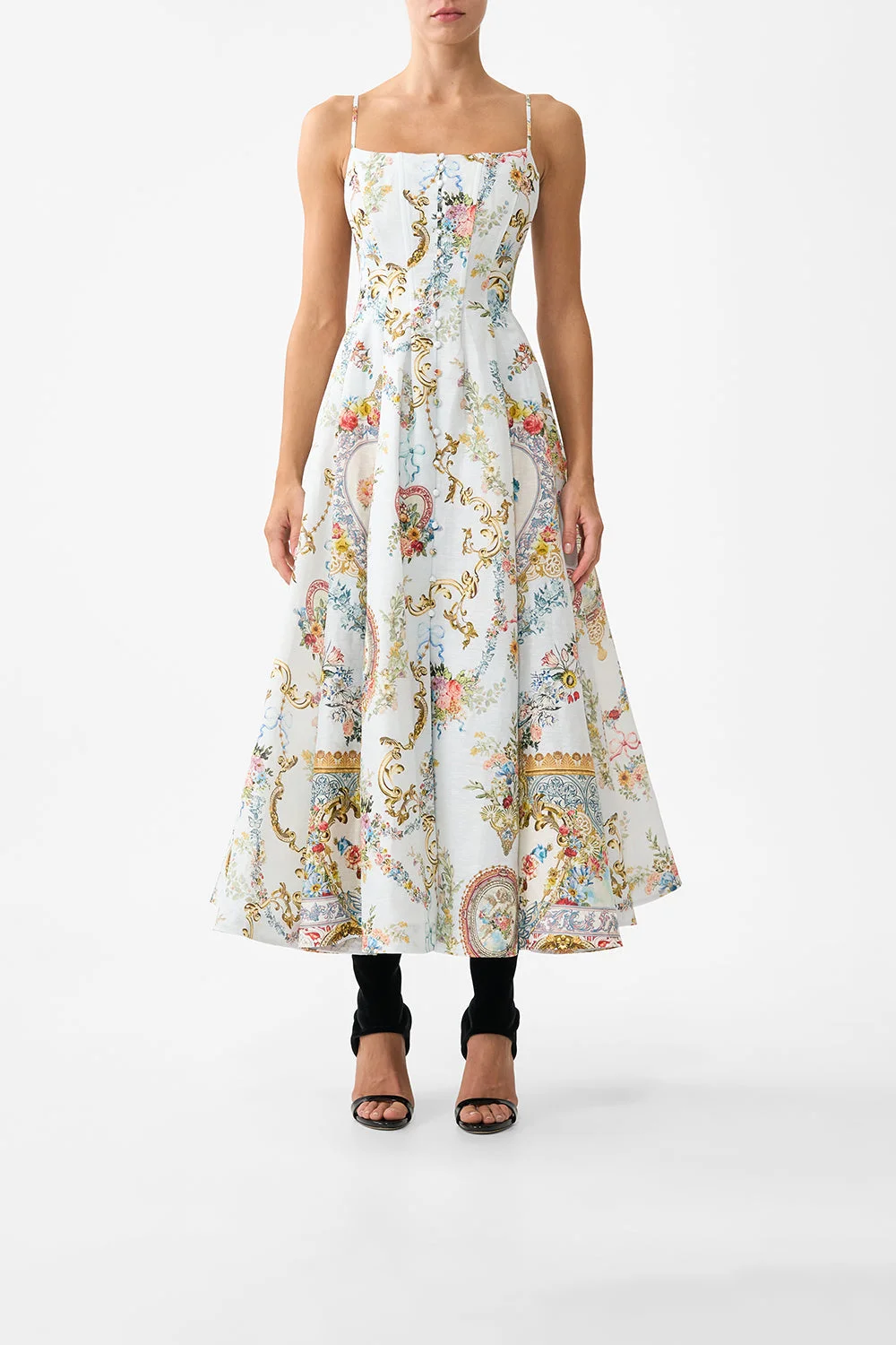 The Seville Sweetheart Corset Dress With Long Flared Skirt is a handcrafted silhouette designed by our in-house artisans. Conceived in an exclusive limited edition print, this silk-linen corset dress is completely lined and crafted with a full, flared skirt that falls to a maxi length hemline. Its adjustable straps and back zip fastening offer versatility while crystal embellishment add luminous detail. - 82% Linen, 18% Silk - Fitted Corset Bodice - Full Length Flared Skirt - Button Through Front - Cenre Front Split - Adjustable Straps - Crystal Embellishment SKU 00040460-SEVISWET-XXS Size and Fit Our model is 5'10 (178cm) tall and wears a size S (AU 10). Bust: 40in (101.6cm) Waist: 26.5in (67cm) Hips: 38in (96.5cm) Fabric and Care 82%LINEN 18%SILK(TWILL) Silk Linen is a beautiful combination of natural fabrics which blend into a luxurious, soft and smooth texture. Cool to touch with a subtle sheen and luster from silk components, its breathable, durable and has a crisp, textured hand feel.
