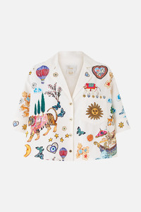 The Kapadokya Kitsch Cropped Camp Collar Blouse is a handcrafted silhouette designed by our in house artisans. Reimagined in an exclusive limited edition print, this cropped blouse is decorated with floral embroidery on the collar and features a front patch pocket detail. Its finished with intricately placed crystal embellishments for luminous detail. - 100% Organic Cotton - Cropped Collared Shirt - Button Front Opening - Back Yoke Detail With Inverted Pleat - Front Pocket - Crystal Embellishment SKU 00040986-KAPAKITC-XXS Size and Fit Our model is 5'10 (178cm) tall and wears a size S (AU 10). Bust: 40in (101.6cm) Waist: 26.5in (67cm) Hips: 38in (96.5cm) Fabric and Care 100% ORGANIC COTTON Organic cotton poplin is sumptuously smooth with a crisp, refined weave. This lightweight silken fabric drapes beautifully and is ideal for sleek contours and tailored, defined styles.