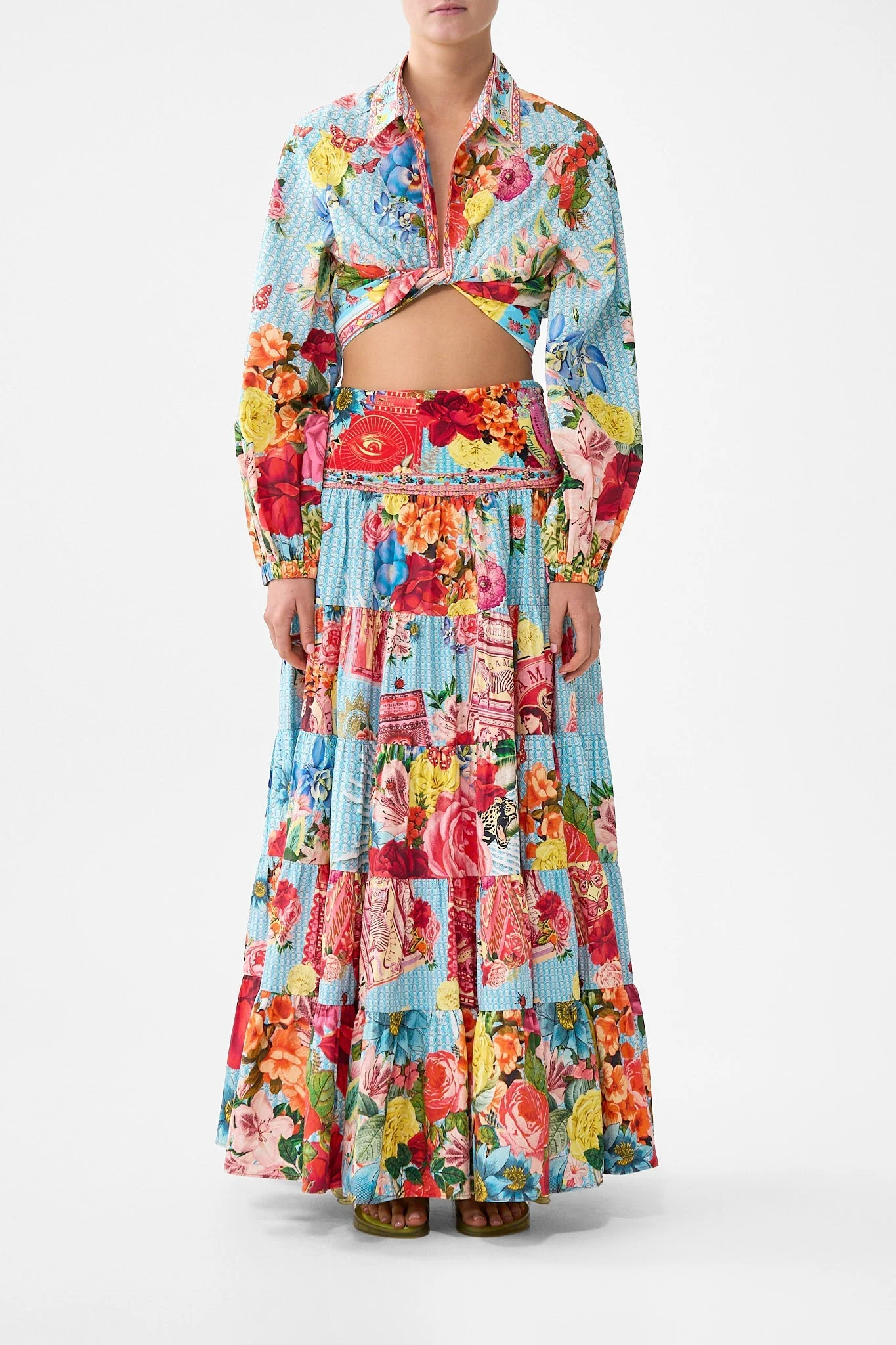The Papers And Curious Capers Cropped Wrap Shirt is a handcrafted silhouette designed by our in house artisans. Reimagined in an exclusive limited edition print, our cropped wrap shirt embodies femininity as a fitted body is cinched with generous ties at the back. Elevated with a collar and long sleeves that dance at elbow length, this blouse tapers along the wrists with detailed cuffs. - 100% Organic Cotton - Full Length Blouson Sleeves With Elasticated Cuffs - Cropped Length - Multiway Front Tie - Collar + Stand - Crystal Embellishment SKU 00038160-PAPECAPE-XXS Size and Fit Our model is 5'10 (178cm) tall and wears a size S (AU 10). Bust: 40in (101.6cm) Waist: 26.5in (67cm) Hips: 38in (96.5cm) Designed and fitted true to size, take your normal size. Fabric and Care 100% ORGANIC COTTON Organic cotton poplin is sumptuously smooth with a crisp, refined weave. This lightweight silken fabric drapes beautifully and is ideal for sleek contours and tailored, defined styles.