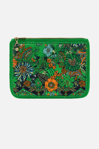 The Good Vibes Generation Crotchet Clutch depicts a 70's inspired scene of vivid green imbued with retro florals. This luxury silk clutch bag features a chic rectangle silhouette accentuated with an intricate hand crocheted edge. With a sleek zip closure, tassel detail and shimmering crystals this statement clutch exudes eternal opulence. Explore more from the Wonderkind collection. - Lovingly Handcrafted - Designed in Australia - CAMILLA Accessories - Crystal embellishment - Tassel with parrot clip - Crotchet edge trim - Zip top closure - 28cm x 22cm SKU 00029344-GOVIBGEN-O/S Fabric and Care MAIN: 100% SILK Silk satin embodies a sumptuously smooth finish that offers a rich buttery touch to the skin. As a result of the satin weaving technique, it masterfully creates a fuller bounce to the body and drape details.