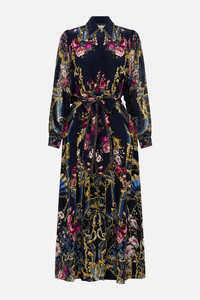 Designed in Australia, the Ornate On A Plate Curved Collar Shirt Dress echoes the charm of Majestic Cafe. Romantic tones and delicate florals blend with delicate desires, inspired by its rich artistic spirit. Lovingly handcrafted, this CAMILLA silk shirt dress features a relaxed straight silhouette that falls to maxi length. The voluminous sleeves are finished with wide button-up cuffs and a waist tie to cinch and shape, adding a romantic edge to this luxury silk shirt dress. - Button Through Front - Adjustable Waist Tie - Blouson Sleeve - Crystal Embellishment SKU 00035679-ORNAPLAT-XXS Size and Fit Our model wears a CAMILLA S and is 5'10 (178cm) tall. Her standard dress size is an AU 10. She has a 32in (83cm) bust, 35in (89.5cm) hips and a 25in (66cm) waist. Camilla S = AU10 / UK10 / US6 Designed as a relaxed fit—take your normal size, or select one size smaller for a neater fit. Fabric and Care 100% SILK With its subtly textured surface, silk crepe is our core fabrication made perfect for versatile wear. With its ability to hold alternative ways to wear, this decadent fabric drapes elegantly off the body whilst keeping you cool with its breathable nature.