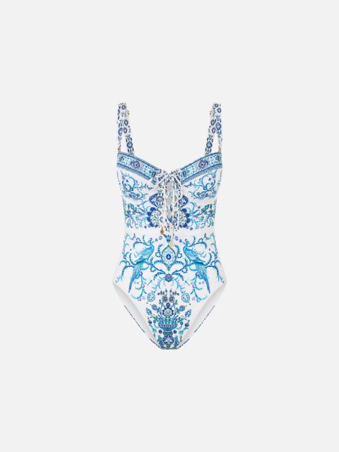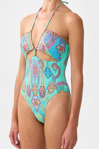 The Concubines Corridor Cut Out Halter One Piece With Front Trim is a handcrafted silhouette designed by our in house artisans. Reimagined in an exclusive limited edition print, our halter one piece is made with an A to B cup in mind with soft removable cups. Featuring a plunging V neckline and cut out details on the front, it’s finished with a halter neck tie adorned with charms. Cut with a regular-to-high leg line and moderate bottom coverage, this style is elevated with gold-tone hardware set with signature crystal embellishments. - Fits A-B Cup - Removable Soft Cups, V Neck - Regular-High Leg Line, Regular Bottom Coverage - Halter Neck Tie With Charms And Cut Out Front - Gold Hardware Detail With Blue Stone - Crystal Embellishment SKU 00037485-CONCCORR-XS Fabric and Care MAIN: 82% REGENERATED POLYAMIDE, 18% ELASTANE ECONYL® is regenerated nylon, crafted from waste materials that would otherwise end up polluting our Mother Earth. Its beauty lies in its ability to be recycled, remoulded and ultimately reused time and time again. An infinitely recyclable product that keeps our planet looking beautiful, it opens the door to a circular fashion sphere.