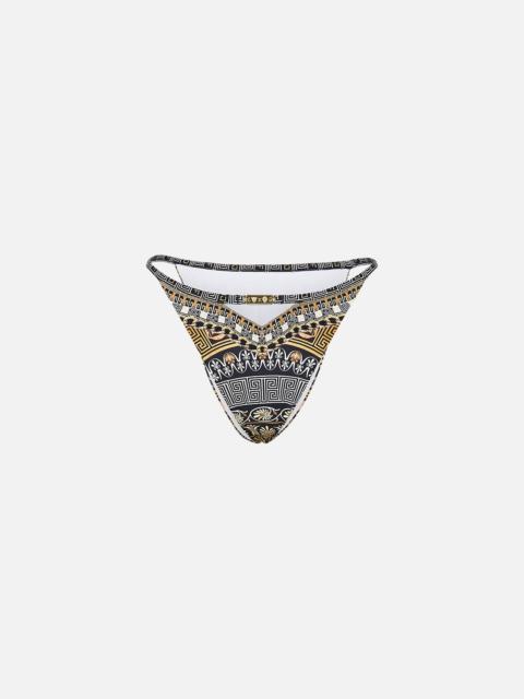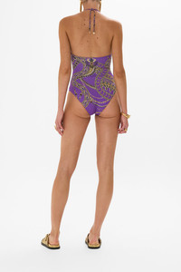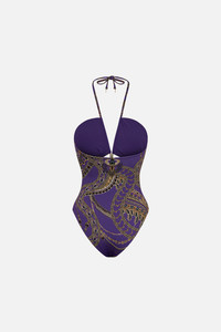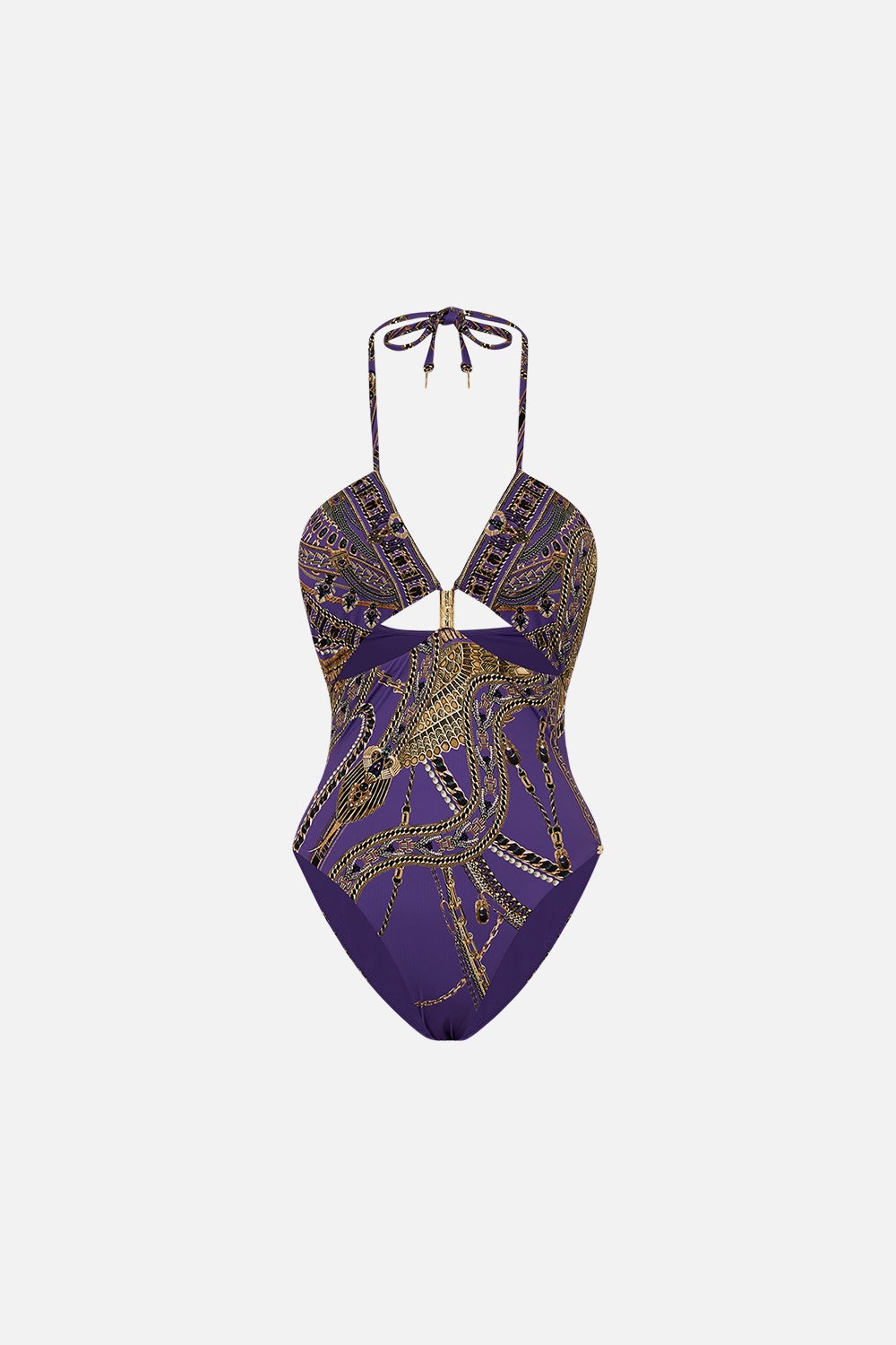 Designed in Australia, The Luxorland Lady Cut Out Halter One Piece With Trim is a fusion of symbolic adornments and Egyptian revival, featuring an ornate blend of purple, gold, and metallic imbued with serpent and jewel detail. Lovingly handcrafted, this luxury CAMILLA swimsuit features a halterneck silhouette with a sleek cut-out front detail. With a fitted line and foiled finish upon the bespoke print, this CAMILLA one-piece swimsuit exudes lavish opulence. - Fits A-B Cup - Removable Soft Cups - Regular-High Leg Line - Halter Neck Tie And Cut Out Front - ECONYL® Swim SKU 00032044-LUXOLADY-XS Size and Fit Our model wears a CAMILLA S and is 5'10 (178cm) tall. Her standard dress size is an AU 10. She has a 32in (83cm) bust, 35in (89.5cm) hips and a 25in (66cm) waist. Camilla S = AU10 / UK10 / US6 Designed and fitted true to size, take your normal size. Fabric and Care MAIN: 82% REGENERATED POLYAMIDE, 18% ELASTANE ECONYL® is regenerated nylon, crafted from waste materials that would otherwise end up polluting our Mother Earth. Its beauty lies in its ability to be recycled, remoulded and ultimately reused time and time again. An infinitely recyclable product that keeps our planet looking beautiful, it opens the door to a circular fashion sphere.
