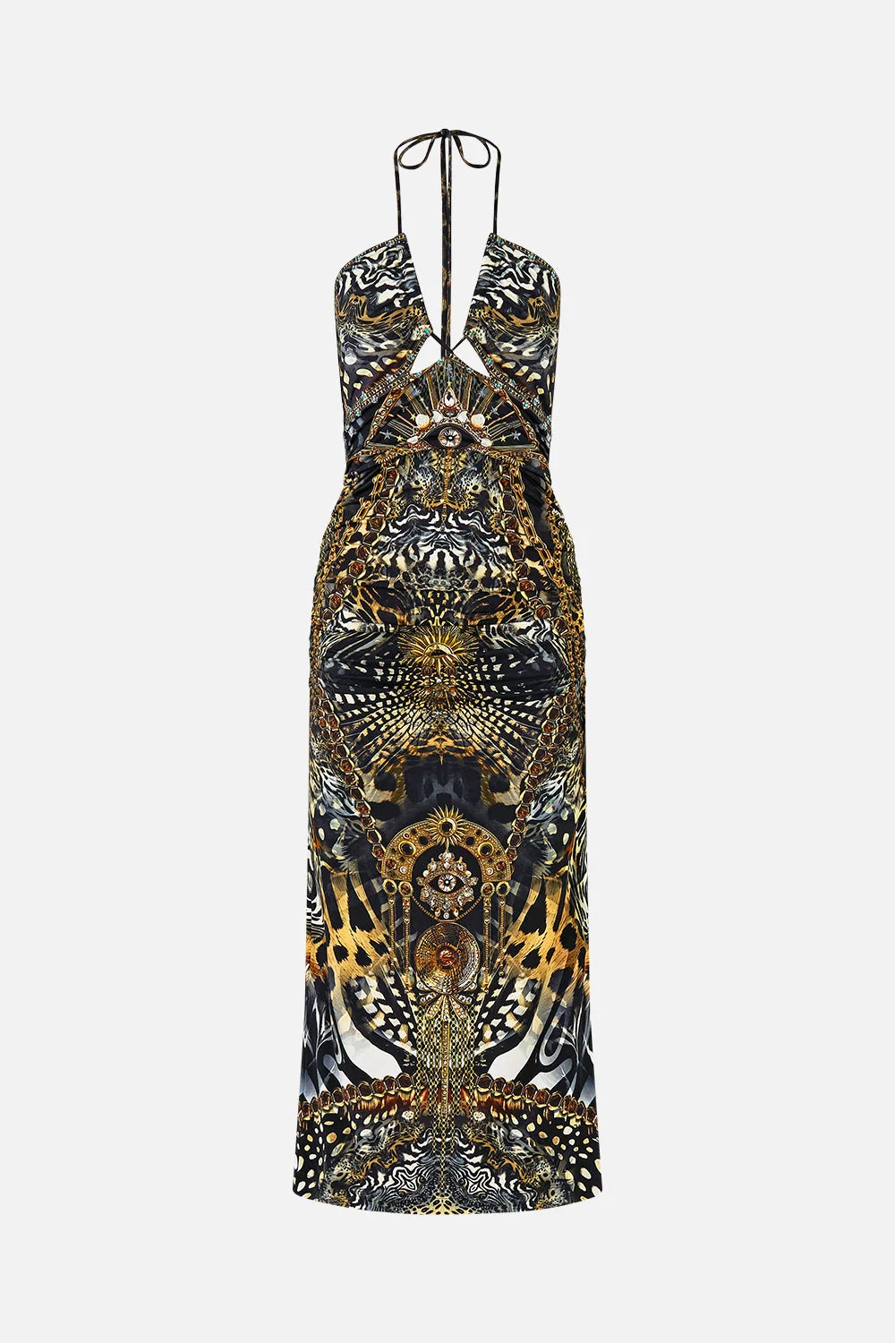 The Feline Folklore Cut Out Sleeveless Jersey Halter Neck Dress is a handcrafted silhouette designed by our in house artisans. Reimagined in an exclusive limited edition print, this stretch jersey halter dress is cut to contour with refined intention. Ruching through the bust and body sculpts and flatters, while a sleek cut out neckline and halter ties add a touch of sensual elevation. Its finished with a side split and crystal embellishments that catch light with every move, an ode to bold femininity and the art of allure. - Stretch Jersey Fabric - Crystal Embellishment - Halter Neck - Ruching Detail Through Bust + Body - Cut Out At Centre Front - Side Split SKU 00038589-FELIFOLK-XXS Size and Fit Designed and fitted true to size, take your normal size. Fabric and Care 92% VISCOSE 8% ELASTANE Viscose is a fibre crafted from the natural substance, cellulose, known for its softness, breathability and drape. It possesses a subtle sheen and is perfect for lightweight soft tailored silhouettes or more structured styles in heavier weights.