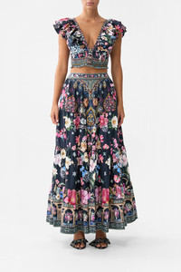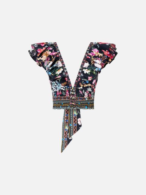 Designed in Australia, The Midnight in Monserrate Deep V Frill Short Sleeve Top celebrates the lush gardens and eclectic nineteenth-century architecture under an exsquisite midnight sky. Lovingly handcrafted, this luxurious ruffle sleeve top features a shaped bust detail that flows into a cropped silhouette. Accented with generous back ties and a button front detail, this charming piece exudes CAMILLA decadence. - Fitted Waist With Adjustable Tie Back - Shirred Front Waistband - Deep V Button Neck With Optional Modesty Clip - Double Layer Neck Frill - Crystal Embellishment - Non-Sheer SKU 00039125-MIDNMONS-XXS Size and Fit Fitted True to Size Fabric and Care 100% ORGANIC COTTON