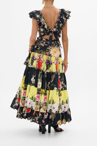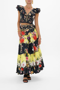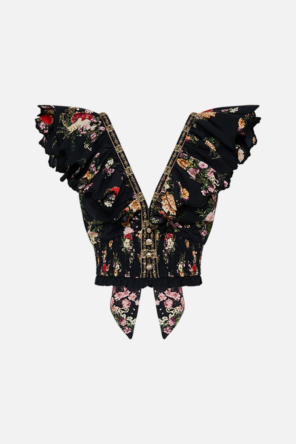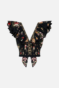 Designed in Australia, The Adorned In Alexandria Deep V Frill Short Sleeve Top unveils an architectural haven where lush florals entwine with majestic archways beneath a tranquil sky. Lovingly handcrafted, this luxurious ruffle sleeve top features a shaped bust detail that flows into a cropped silhouette. Accented with generous back ties and a button front detail, this charming piece exudes CAMILLA decadence. - Fitted Waist With Adjustable Tie Back - Shirred Front Waistband - Deep V Button Neck With Modesty Clip - Broderie Anglaise Frill - Crystal Embellishment SKU 00031982-ADORALEX-XXS Size and Fit Our model wears a CAMILLA S and is 5'10 (178cm) tall. Her standard dress size is an AU 10. She has a 32in (83cm) bust, 35in (89.5cm) hips and a 25in (66cm) waist. Camilla S = AU10 / UK10 / US6 Designed and fitted true to size, take your normal size. Fabric and Care 100%ORGANIC COTTON Organic cotton poplin is sumptuously smooth with a crisp, refined weave. This lightweight silken fabric drapes beautifully and is ideal for sleek contours and tailored, defined styles.