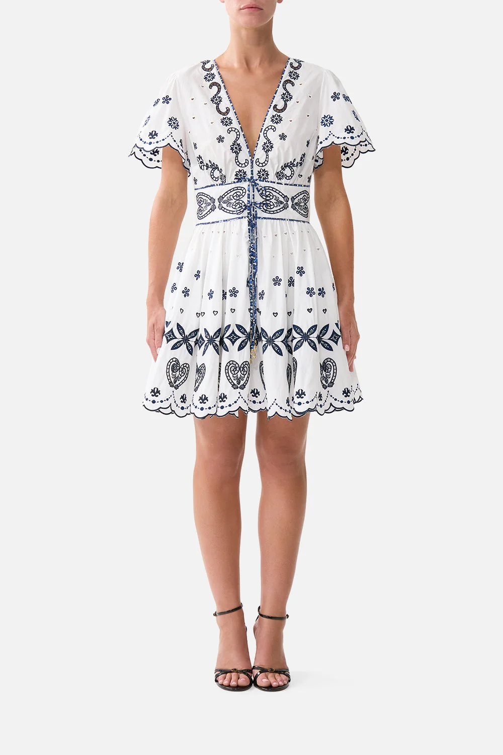 The A Tiled Wonderland Deep V Mini Dress With Ties is a handcrafted silhouette designed by our in-house artisans. Thoughtfully cut by master craftsmen, this cotton mini dress is adorned with short, scalloped sleeves and features intricately embroidered details. Cinch and shape at the waist with tie finishings as the fabric flows into a cropped A-line silhouette. - 100% Organic Cotton - Fit And Flare Silhouette - Deep V Neckline - Center Front Tie Detail - Piping Detail - Embroidery Details SKU 00040104-ATILWOND-XS Size and Fit Our model is 5'10 (178cm) tall and wears a size S (AU 10). Bust: 40in (101.6cm) Waist: 26.5in (67cm) Hips: 38in (96.5cm) Fabric and Care 100% COTTON Organic cotton poplin is sumptuously smooth with a crisp, refined weave. This lightweight silken fabric drapes beautifully and is ideal for sleek contours and tailored, defined styles.