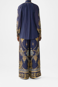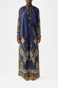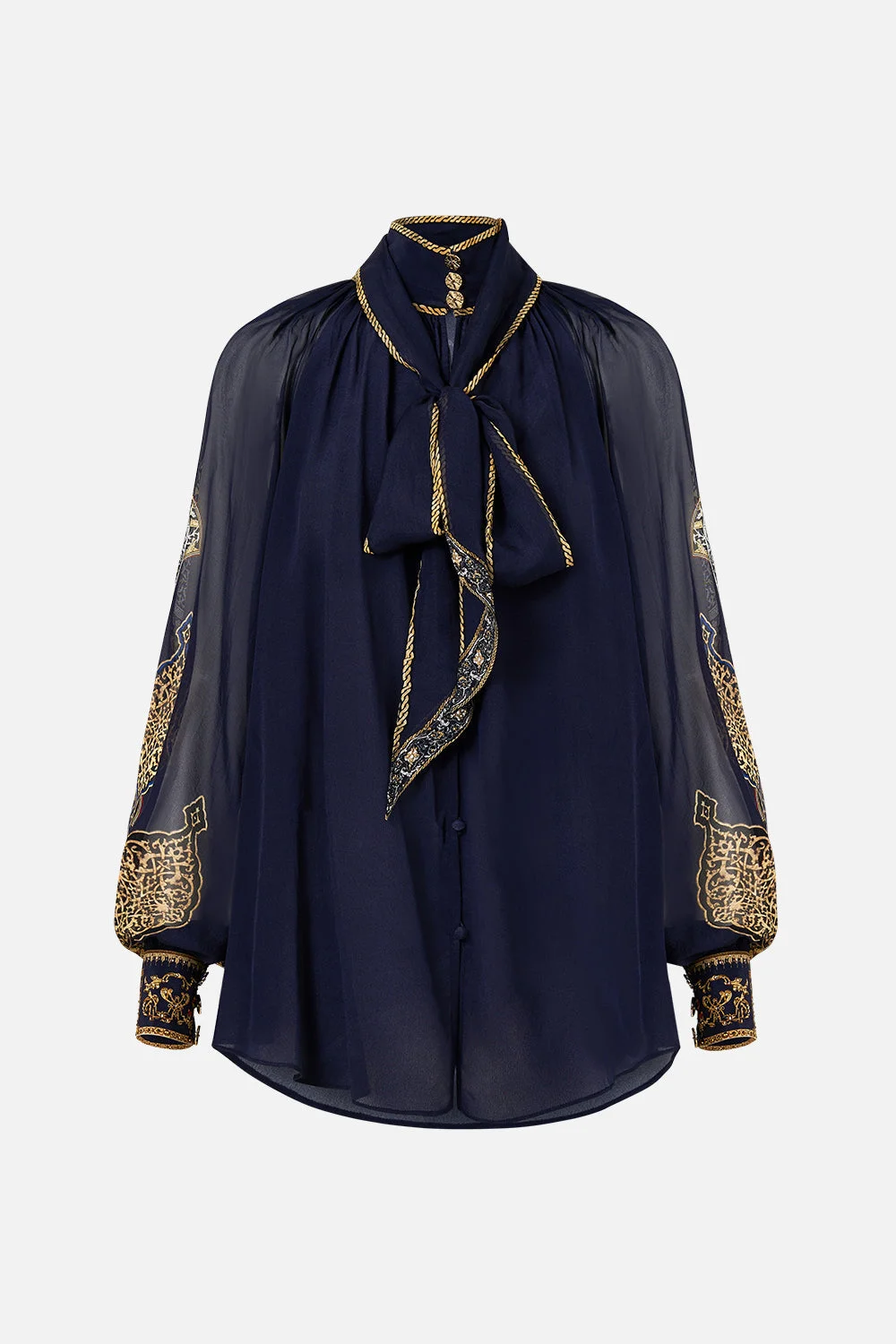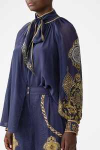 The The Imperial Gate Detachable Pussy Bow Raglan Blouse is a handcrafted silk silhouette designed by our in house artisans. Reimagined in an exclusive limited edition print, our relaxed blouse features a structured high collar and detachable pussy bow neck tie for versatile styling options. Relaxed raglan sleeves fall into voluminous blouson arms, finished with buttoned cuffs for a tailored edge. A gently flared hem offers ease of movement and can be styled tucked or loose. - 100% Silk - Detachable Neck Tie - Blouson Sleeve - Buttoned Cuffs And Collar - High Collar And Stand SKU 00037836-IMPEGATE-XXS Size and Fit Designed as a relaxed silhouette. Take your normal size, or select one size smaller for a neater fit. Fabric and Care SELF-100% SILK CONTRAST-100% SILK With its subtly textured surface, silk crepe is our core fabrication made perfect for versatile wear. With its ability to hold alternative ways to wear, this decadent fabric drapes elegantly off the body whilst keeping you cool with its breathable nature.