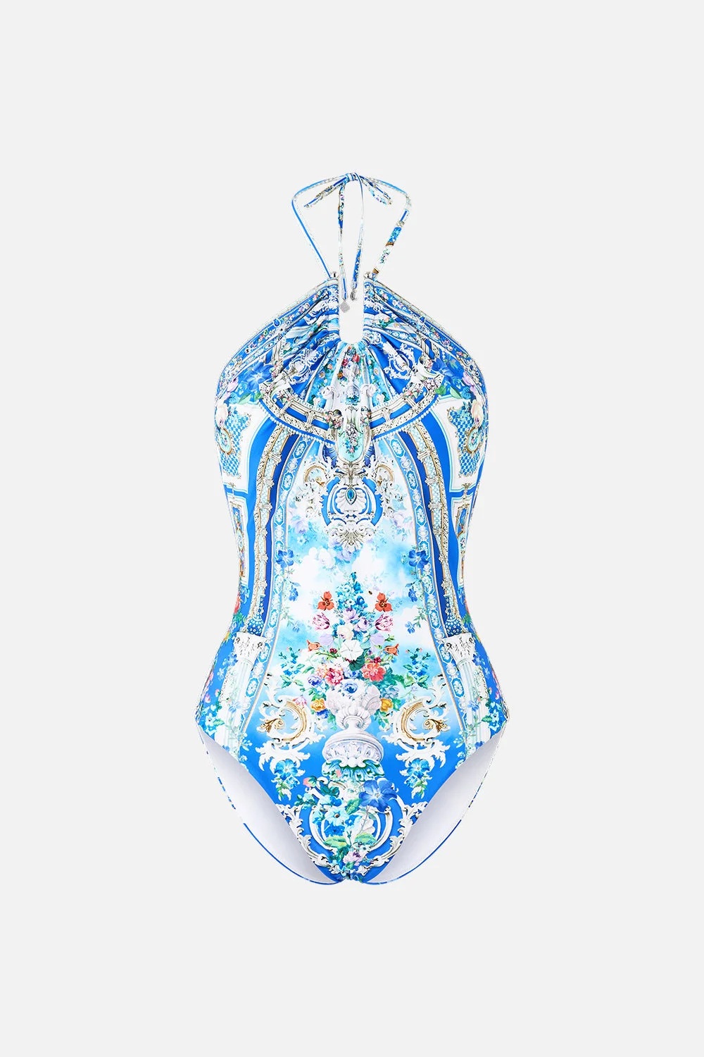 The Ottoman Opulence Diamond Neck Halter One Piece With U Ring Front is a handcrafted silhouette designed by our in house artisans. Reimagined in an exclusive limited edition print, this halter neck one piece is made with A to C cups in mind with soft, removable cups. Its high neck is secured by halter neck ties with charm details at the ends and is cut with a regular leg line. It features a U ring hardware detail at the front and is finished with intricately placed crystal embellishment for luminous detail. - Fits A-C Cup - Removable Soft Cups - High Neck With Halter Neck Tie And Charm Detail - U-Ring Detail At Front Neck - Regular To High Leg Line - Crystal Embellishment SKU 00039372-OTTOOPPU-XS Size and Fit Our model wears a CAMILLA O/S and is 5'10 (178cm) tall. Her standard dress size is an AU 10. She has a 32in (83cm) bust, 35in (89.5cm) hips and a 25in (66cm) waist. Fabric and Care MAIN: 82% REGENERATED POLYAMIDE, 18% ELASTANE