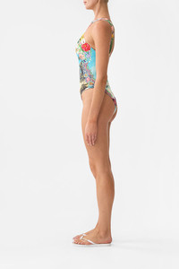 Designed in Australia, the Bathing Bombshell High Neck One Piece With Trims evokes a vibrant symphony of blooms that encapsulate crystalline waves, sun-soaked moments linger as an ode to Portugal's decadent artistry. Lovingly handcrafted, this gorgeous one-piece combines structure and grace. Best suited for an A-C cup bust, it features removable soft cups, trim details, and a scoop back, all adorned with crystal embellishments. - Fits A-C Cup - Removable Soft Cups - High Neck With Soft Gathered Straps - Trim Detail On Front & Back - Scoop Back - Crystal Embellishment SKU 00036070-BATHBOMB-XS Fabric and Care MAIN: 82% REGENERATED POLYAMIDE, 18% ELASTANE ECONYL® is regenerated nylon, crafted from waste materials that would otherwise end up polluting our Mother Earth. Its beauty lies in its ability to be recycled, remoulded and ultimately reused time and time again. An infinitely recyclable product that keeps our planet looking beautiful, it opens the door to a circular fashion sphere.
