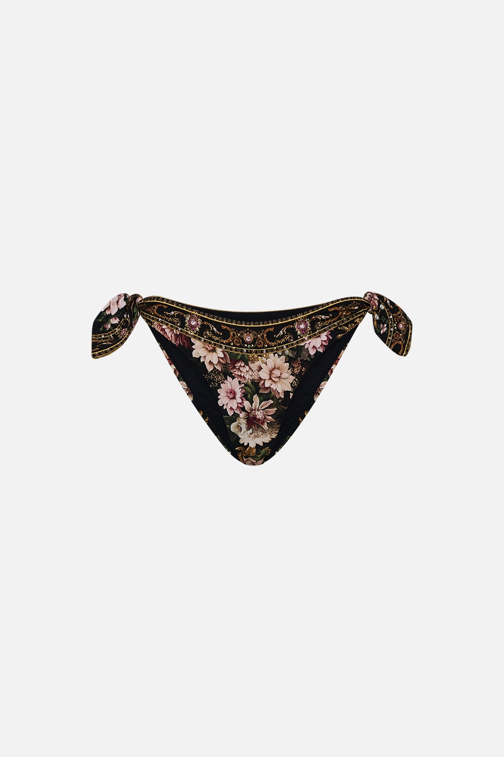 The Dynasty Daze Dip Front Pant With Ties is an immersion into an opulent world of rich black adorned with delicate florals and decorative golden fronds. Indulge in sustainable style with these bikini bottoms, crafted from ECONYL® regenerated nylon. The bikini bottoms feature a high-cut design, which elongates the legs to create a sleek silhouette. - Lovingly Handcrafted - Design in Australia - CAMILLA Ready-to-wear - ECONYL® swim - Cheeky coverage - Dipped front - Side ties - Crystal embellishment SKU 00030743-DYNADAZE-XS Size and Fit Our model wears a CAMILLA S and is 5'10 (178cm) tall. Her standard dress size is an AU 10. She has a 32in (83cm) bust, 35in (89.5cm) hips and a 25in (66cm) waist. Camilla S = AU10 / UK10 / US6 Fabric and Care 82% POLYAMIDE, 18% ELASTANE
