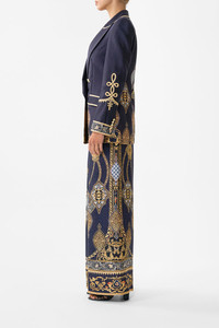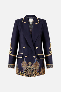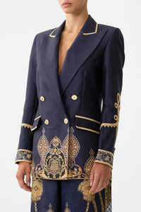 The The Imperial Gate Double Breasted Suit Jacket is a handcrafted silhouette designed by our in house artisans. Reimagined in an exclusive limited edition print, our suit jacket is double breasted and features an opulent wide peaked lapel. Decorated with front flap pockets and elevated with opulent corded trim details. - 53% Wool, 47% Silk - Wide Peaked Lapel - Double Breasted - Front Flap Pockets - Corded Trim Details SKU 00036611-IMPEGATE-XS Size and Fit Our model is 5'10 (178cm) tall and wears a size S (AU 10). Bust: 40in (101.6cm) Waist: 26.5in (67cm) Hips: 38in (96.5cm) Designed and fitted true to size, take your normal size. Fabric and Care 53% WOOL 47% SILK Pairing these two luxury fibres showcases the insulating and breathable nature of both wool and silk to create a sleek, durable fabric with luxurious wearability. Embodying the best of both worlds silk wool suiting blends the lustrous wrinkle resistant finish of silk with the luscious weight and drape of wool.