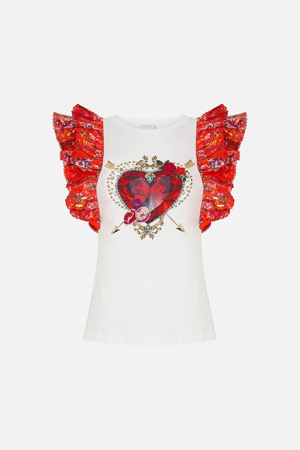 The OlE OlE Double Frill Sleeve Tee is a handcrafted silhouette designed by our in-house artisans. Created in an exclusive limited edition print, this cotton tee is cut in a slim fit with a flattering rounded neckline. Ruffle sleeves trimmed with delicate scalloped edging add a touch of movement, while its crystal embellishment brings luminous detail. - 100% Organic Cotton - Slim Fit - Ruffle Sleeves - Round Neckline - Crystal Embellishment - Organic Cotton Jersey Body - Organic Cotton Poplin Sleeve Ruffles SKU 00040617-OLEOLEEE-XXS Size and Fit Our model is 5'10 (178cm) tall and wears a size S (AU 10). Bust: 40in (101.6cm) Waist: 26.5in (67cm) Hips: 38in (96.5cm) Designed and fitted true to size, take your normal size. Fabric and Care 100% COTTON , CONST- 96% COTTON 4% SPANDEX Organic cotton is breathable, lightweight fabric. With a natural texture, it holds its shape gracefully and is perfect for soft, everyday silhouettes.