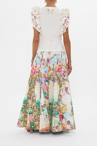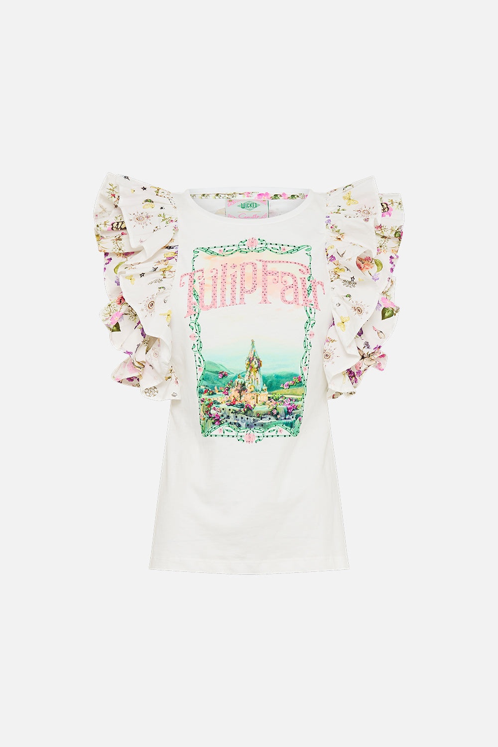 Designed in Australia, The Munchkinland Double Frill Sleeve Tee unveils a magical tapestry of storytelling that transcends gravity and expectations, adorned with blue skies, rainbows, and tulip fields. Whimsical elements intertwine to reveal a profound tale of friendship—boundless and eternal. Lovingly handcrafted, this frill tee features a slim fit with charming ruffle sleeves and a flattering round neckline. Adorned with sparkling crystal embellishments, it effortlessly combines sophistication with playful elegance. - Slim Fit - Ruffle Sleeves - Round Neckline - Crystal Embellishment - CAMILLA printed SKU 00036319-MUNCHKIN-XXS Size and Fit Our model wears a CAMILLA S and is 5'10 (178cm) tall. Her standard dress size is an AU 10. She has a 32in (83cm) bust, 35in (89.5cm) hips and a 25in (66cm) waist. Camilla S = AU10 / UK10 / US6 Designed and fitted true to size, take your normal size. Fabric and Care 100% COTTON Organic cotton is breathable, lightweight fabric. With a natural texture, it holds its shape gracefully and is perfect for soft, everyday silhouettes.