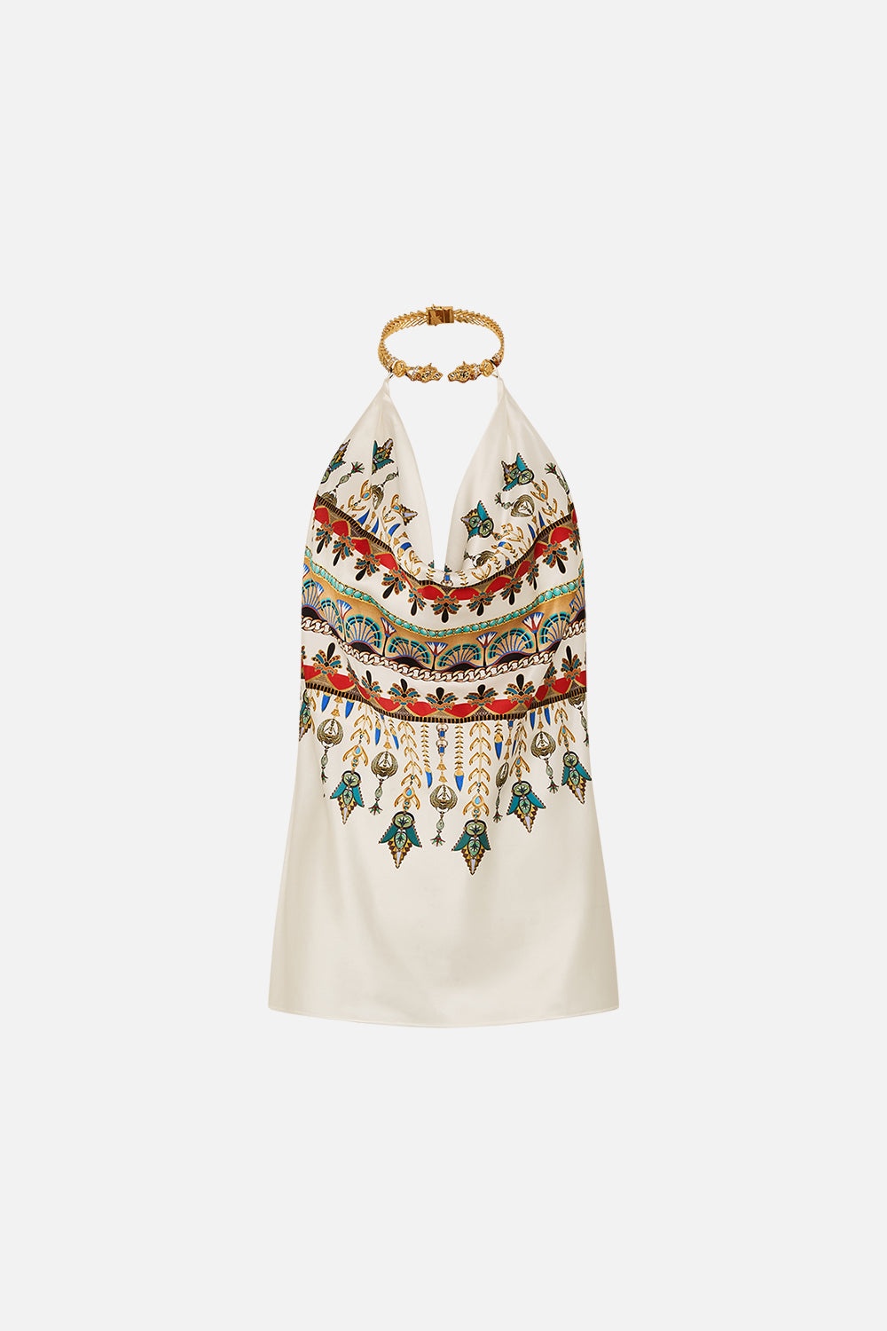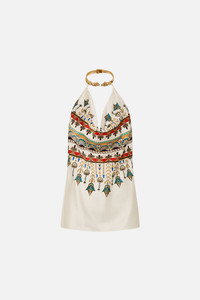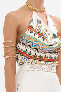 The Valley Of The Queens Draped Top With Hardware emulates a world of sacred symbols etched amongst a canopy of luscious fronds, regal wings and ancient deities. An esquisite silk halter top that features a detachable hardware neckpiece, this CAMILLA silk top exudes opulence and lustre with an elegant cowl neckline and scooped back upon a slim fit silhouette that falls to hip level. Refer to our fabric and care guide for detailed guidance on wearing your neckpiece. - Lovingly Handcrafted - Designed in Australia - CAMILLA Ready-To-Wear - Slim fit - Hip length - Draped halter neckline - Bespoke camilla neckpiece - Scooped back neckline - Lowered armholes SKU 00030074-VALLOTQU-XXS Size and Fit Our model wears a CAMILLA S and is 5'10 (178cm) tall. Her standard dress size is an AU 10. She has a 32in (83cm) bust, 35in (89.5cm) hips and a 25in (66cm) waist. Camilla S = AU10 / UK10 / US6 Designed as a true to size fit take your normal size Fabric and Care 100% SILK Silk satin embodies a sumptuously smooth finish that offers a rich buttery touch to the skin. As a result of the satin weaving technique, it masterfully creates a fuller bounce to the body and drape details. Neckpiece Care Unlock the neckpiece by gently pressing down on the clasp located at the back and release. To secure your elegant design in place, simply press down on the clasp once more, locking the neckpiece with effortless poise.