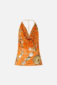 The Talismans Of Turkiye Draped Top With Hardware is a handcrafted silhouette designed by our in house artisans. Reimagined in an exclusive limited edition print, this divinely draped top features a sumptuous cowl neck cut that effortless falls to a hip length hemline. It is finished with a chain neckpiece and charms adding decadent detail. - Cowl Neck - Hip Length - Draped Front - Chain Neckpiece With Charms SKU 00038849-TALITURK-XS Size and Fit Our model is 5'10 (178cm) tall and wears a size S (AU 10). Bust: 40in (101.6cm) Waist: 26.5in (67cm) Hips: 38in (96.5cm) Designed and fitted true to size, take your normal size. Fabric and Care 80% SILK, 20% METALLIC