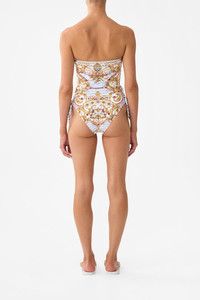 Designed in Australia, The Throne Games Strapless Eyelet Tie One Piece welcomes you to the Palace of Queluz, where ornate rococo details and fine architectural artistry are framed by an elegant floral border. Lovingly handcrafted, this strapless one-piece swimsuit features removable soft cups, adjustable straps, and eyelet tie details, finished with crystal accents. - Fits B-C Cup - Removable Soft Cups - Removable And Adjustable Straps - Side Eyelet Detail With Ties - Crystal Embellishment - ECONYL® swim SKU 00034377-THRNGMES-XS Size and Fit Our model wears a CAMILLA S and is 5'10 (178cm) tall. Her standard dress size is an AU 10. She has a 32in (83cm) bust, 35in (89.5cm) hips and a 25in (66cm) waist. Camilla S = AU10 / UK10 / US6 Designed and fitted true to size, take your normal size Fabric and Care MAIN: 79% POLYAMIDE, 21% ELASTANE